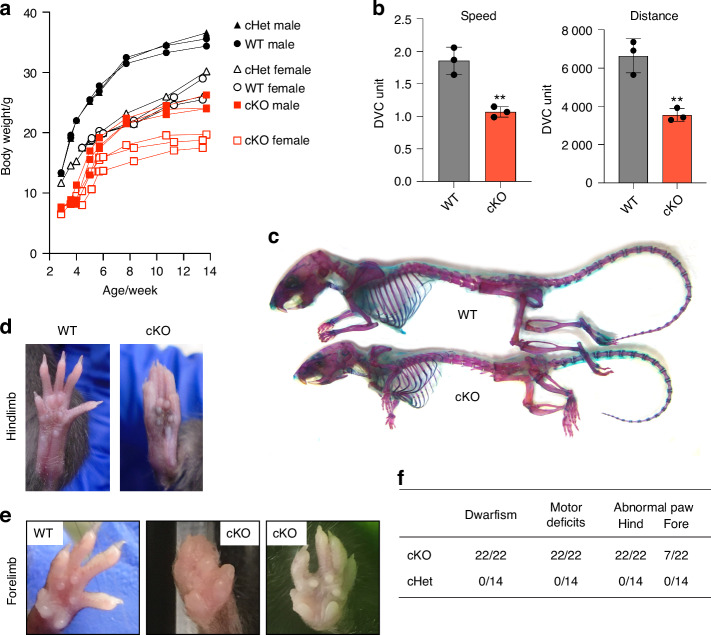 Fig. 3. LRP1 deficiency in skeletal progenitors results in dwarfism, impaired mobility and fore/hind limb malformation. a Mouse weight measurement from 3-14 weeks after birth. Closed (male) and open (female) black circles (WT), black triangles (cHet; Lrp1flox/wt/Prrx1Cre heterozygote conditional KO), and red squares (cKO; Lrp1flox/flox/Prrx1Cre homozygote conditional KO) represent individual mice. b Total distance and average speed of WT and cKO mice. Locomotor activity of 6-week-old mice measured by the continuous automated home-cage monitoring system for 4 weeks. Circles represent individual mice and bars show the mean ± SD. **P < 0.01 by 2-tailed Student’s t test. c Whole-mount skeletal staining of 14-week-old mice with Alcian blue and Alizarin red. d Photographs of 8-week-old WT and the cKO hind paws. e Photographs of 8-14-week-old WT and the cKO fore paws. f Table showing the frequencies of the identified phenotypes |
