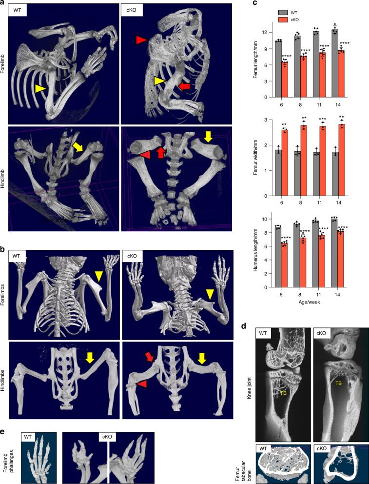 Fig. 4. Severe and persistent defects in multiple bones and joint in Lrp1flox/flox/Prrx1Cre mice. Representative images of in vivo X-ray analysis of limbs of 2-week-old (a) and 14-week-old (b) WT and Lrp1flox/flox/Prrx1Cre homozygote conditional KO (cKO) mice. Yellow arrowheads and arrows indicate humerus and femur quantified in c. Red arrowheads and arrows indicate undefined shoulder blades and twisted long bones (top panels), and undefined knee and lack of hip joints (bottom panels) in cKO mice, respectively. c Femur and humerus bone length and femur width of 6-14-week-old mice. Circles represent individual mice and bars show the mean ± SD. **P < 0.01; ***P < 0.001; ****P < 0.000 1 by 2-tailed Student’s t test. d Representative images of high-resolution μCT analysis of femur trabecular bones of 14-week-old mice. TB, trabecular bone. e Representative images of in vivo X-ray analysis of forelimb phalanges of 14-week-old cKO mice |