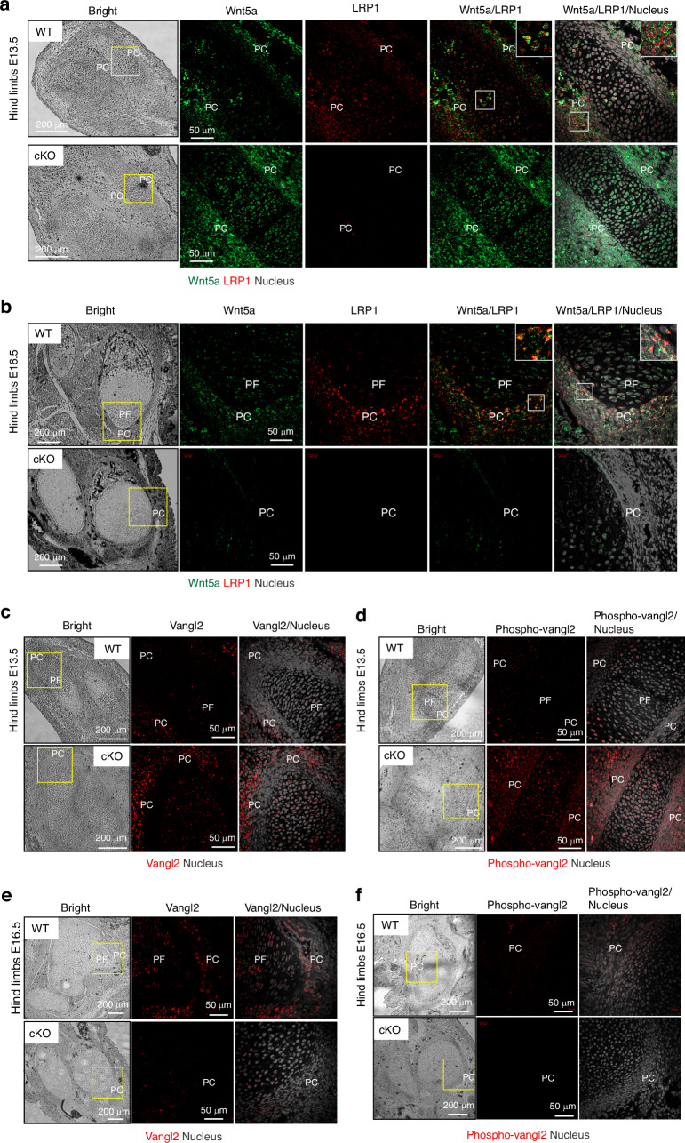 Fig. 7. LRP1 partially colocalises with Wnt5a and its deficiency alters abundance and distribution of Wnt5a in the developing limbs. Representative images of confocal microscopy analysis for Wnt5a and LRP1 (a and b), and total (c and e) and phosphorylated Vangl2 (d and f) in E13.5 (a, c and d) or E16.5 (b, e and f) hind limb sections of WT and Lrp1flox/flox/Prrx1Cre (cKO) mice (n = 3). Wnt5a, LRP1, Vangl2, phospho-Vangl2 and nucleus were visualised as described under “Materials and Methods”. Regions delineated by the white squares have been magnified in the top right of each panel. PF proliferative flattened chondrocytes; PC perichondrium. Scale bar, 50 µm |