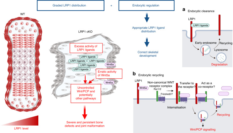 Fig. 9. A novel and critical role for LRP1 in skeletal development and its deficiency in emergence of skeletal pathologies. Skeletal progenitor LRP1 is likely to have at least two different functions: to remove molecules from extracellular milieu and degrad them intracellularly (a), and to capture, recycle and distribute molecules (b). Combination of graded distribution of LRP1 and LRP1-mediated endocytosis regulates distribution of extracellular signalling molecules. This provides a novel mechanism for appropriate distribution of extracellular signalling molecules to ensure that bone and joint form correctly. Thus, loss of LRP1 leads to excess activity of some of LRP1 ligands and erratic Wnt/PCP signalling, resulting in severe defects in multiple bones and joints. Illustration created with BioRender (https://biorender.com) |
