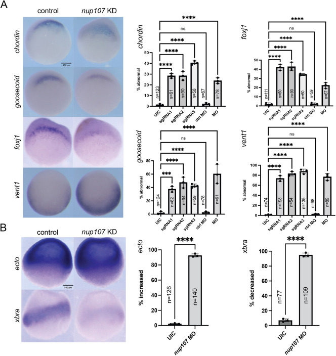 Fig. 2. Nup107 depletion alters germ layer specification. (A) Representative images of whole-mount in situ hybridization embryos at stage 10 demonstrating reduced expression levels of dorsal mesodermal markers (chordin, goosecoid, foxj1) and upregulated expression of a ventral mesodermal marker (vent1) due to Nup107 depletion. (B) Whole-mount in situ hybridization images of embryos at stage 10 showing upregulated ectodermal marker (ectodermin) and reduced mesodermal marker (xbra) expression in Nup107-depleted embryos. Three biological replicates were used for all experiments. All data represent results from experiments replicated at least three times in the laboratory. Statistical significance was determined using two-way ANOVA analysis. ***P<0.001, ****P<0.0001. ns, not significant. Data are mean±s.d. Scale bars: 500 μm.