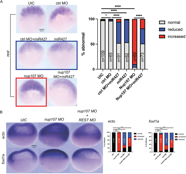 Fig. 6. rest is a potential target of miR427 and a regulator of ectodermal patterning. (A) Whole-mount in situ embryos at stage 8 demonstrating the effect of Nup107 depletion and miR427 overexpression on the changes in rest expression patterns. (B) Whole-mount in situ embryos at stage 10 demonstrating ectodermal marker (ectodermin and foxi1a) expression changes in Nup107- and Rest-depleted embryos. Three biological replicates were used for all experiments. All data represent results from experiments replicated at least three times in the laboratory. Statistical significance was determined using two-way ANOVA analysis. ****P<0.0001. ns, not significant. Scale bars: 500 μm.