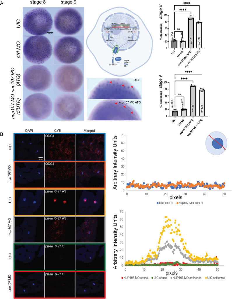 Fig. 7. The expression and subcellular localization of pri-miR427. (A) Whole-mount in situ hybridization demonstrating the expression domain of pri-miR427. Higher magnification images at lower right reveal nuclear staining (red arrowheads). Cell diagram was created in BioRender by Kostiuk, V., 2025. https://BioRender.com/x94m509. This diagram was sublicensed under CC-BY 4.0 terms, and subsequently annotated. (B) (Left) Using RNAScope, subcellular localization of the pri-miR427 (AS, antisense; S, sense) and odc1 transcript (a housekeeping gene control). (Right) Signal quantification of odc1 (top) and pri-miR427 (bottom). The following number of embryos were used for this experiment: sense pri-miR427 probe: 16 Nup107-depleted embryos and 20 control embryos; antisense pri-miR427 probe: 20 Nup107-depleted embryos and 18 control embryos; antisense odc1 probe: 19 Nup107-depleted embryos and 17 control embryos. The confidence intervals for measurements were: sense pri-miR427 probe: nup107 MO sample 1.3±0.6 (0.7-1.8), UIC sample 0.9±0.4 (0.6-1.3); antisense pri-miR427 probe: nup107 MO sample 10.3±3.4 (6.9-13.8), UIC sample 18.8±7.4 (11.4-26.2); antisense odc1 probe: UIC sample 5.7±0.8 (4.9-6.5), nup107 MO sample 6.3±0.8 (5.5-7.0). Three biological replicates were used for all experiments. All data represent results from experiments replicated at least three times in the laboratory. Statistical significance was determined using two-way ANOVA analysis. P<0.05 was considered statistically significant. ****P<0.0001. ns, not significant. Scale bars: 500 μm (A); 10 μm (B).