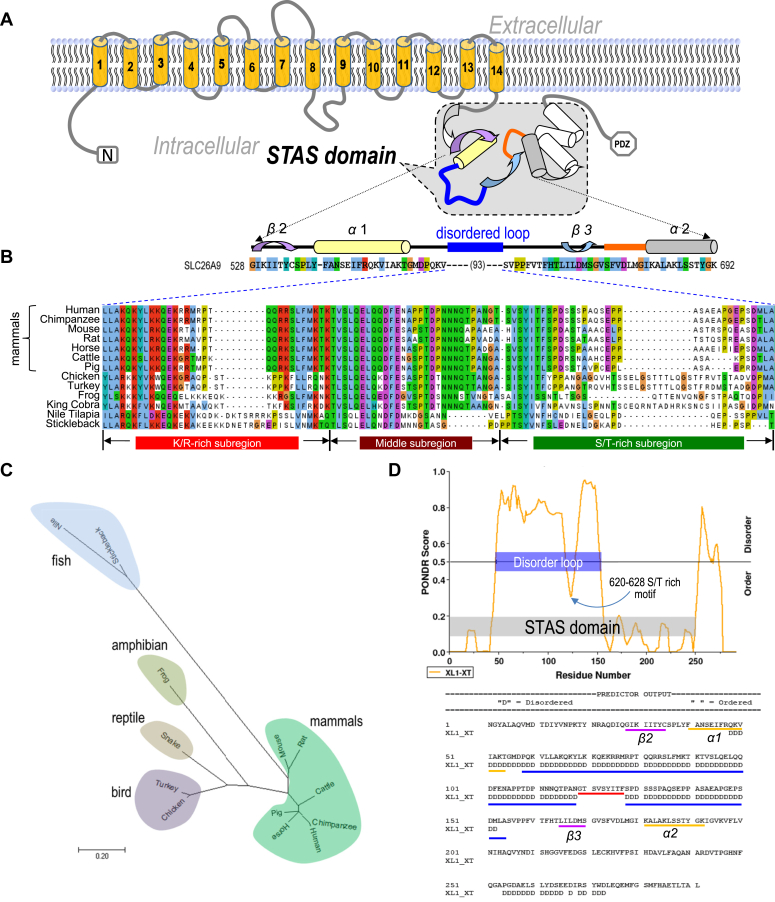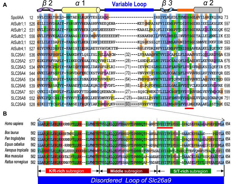 Figure 2. Alignment of partial STAS domains for SpoIIAA, sulfate transporters in Arabidopsis, and SLC26 family members. A, alignment of STAS domains for SpoIIAA, sulfate transporters in Arabidopsis, and SLC26 family members (shown from β2 to α2 region). The disordered loop (blue block), a conserved loop (orange block), and a conserved phosphorylation motif (D[S/T](2)G) (red block) are indicated. B, alignment of the disordered loop for Slc26a9 members. A Ser/Thr cluster (red block) is indicated in human SLC26A9. The Slc26a9 disordered loop (blue block) can be subdivided into three subregions: K/R-rich (red block); middle (wine block), and S/T-rich (green block). STAS, sulfate transporter and anti-sigma. |