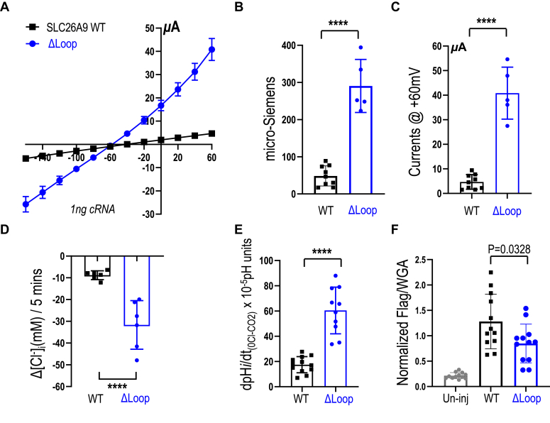 Figure 4. Deletion of disordered loop increases SLC26A9 function in Xenopus oocytes. A, I to V relationship obtained from voltage-clamp experiments in Xenopus oocytes. SLC26A9 WT (black) and Δ-loop (blue)-injected oocytes were clamped to −60 mV in the ND96 solution (black square) and Cl--free ND96 solution (blue circle). B, the conductance (μSiemens), that is., slope of individual I to V curves calculated between −160 to +60 mV (panel A), for SLC26A9 WT (black) and Δ-loop (red). C, relative currents for ΔLoop (at +60 mV) are dramatically great than that of SLC26A9-injected oocytes). D, measurement of intracellular Cl- [Cl-]i activity for SLC26A9-injected oocytes (black) and ΔLoop-injected oocytes (blue). In the presence of ND96 solution, pH 7.5, extracellular Cl- was replaced by gluconate (0 Cl-) to show Cl- channel activity. Average Cl- transport response (Δ [Cl-]i = end[Cl-]i - initial[Cl-]i) in presence of Cl--free ND96 are indicated in the column graphs. E, simultaneous measurement of intracellular pH (pHi) and membrane potential in Xenopus oocytes expressing SLC26A9 (black, left) and Δ-loop (blue, right). In the presence of 5% CO2, 33 mM HCO3, pH 7.5, ND96 solution, extracellular Cl- was replaced by gluconate (0 Cl-) to show Cl--HCO3- exchange activity (increase in pHi during 0 Cl-). The pHi transport response (Δ[pH]i = end[pH]i - initial[pH]i) divided by time of the initial slope (5 min) in units “10-5 pH unit∗s-1,” in presence of 5% CO2, 33 mM HCO3, pH 7.5, ND96 solution are indicated in the column graphs. F, The normalized ratio of anti-flag signal versus WGA (wheat germ agglutinin) signal representing the relative surface protein expression level is displayed for triple-flag tagged SLC26A9 WT and triple-flag tagged SLC26A9 Δloop. The uninjected oocytes were used as negative controls. Individual points in bar graphs are individual oocyte experiments. Error bars represent mean ± SD. Student t test was used for statistical analysis. Individual points in bar graphs are individual oocyte experiments. Error bars represent mean ± SD. ∗∗∗∗ denotes p ≤ 0.0001 by Student’s t test. |