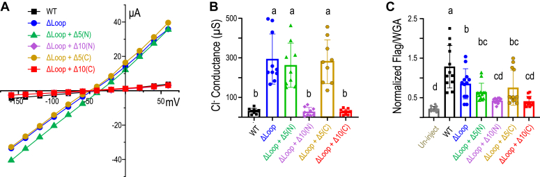 Figure 6. Functional investigate the boundaries of the disordered Loop within STAS domain of SLC26A9.A, I to V relationship obtained from voltage-clamp experiments in Xenopus oocytes expressing SLC26A9-WT, SLC26A9 ΔLoop, SLC26A9 ΔLoop + Δ5(N), SLC26A9 ΔLoop + Δ10(N), SLC26A9 ΔLoop + Δ5(C), and SLC26A9 ΔLoop + Δ10(C) in standard ND96 solution. For clarity, SDs are not shown here but rather in Fig. S1. B, the conductance calculated as the slope of I to V curves from voltage-clamp experiments in Xenopus oocytes expressing SLC26A9 WT, SLC26A9 ΔLoop, SLC26A9 ΔLoop+Δ5(N), SLC26A9 ΔLoop+Δ10(N), SLC26A9 ΔLoop+Δ5(C), and SLC26A9 ΔLoop+Δ10(C) in standard ND96 solution. Individual points in bar graphs are individual oocyte experiments. Error bars represent mean ± SD (n = 10–12). The results of the statistical analysis are indicated by lowercase letters, that is,. groups sharing letters are statistically similar, whereas those not sharing any letters are significantly different (p < 0.0001, one-way ANOVA with post hoc Tukey test for multiple comparisons). C, the normalized ratio of anti-Flag signal versus wheat germ agglutinin (WGA) signal representing the relative surface protein expression level were displayed for triple-Flag–tagged SLC26A9WT, triple-Flag–tagged SLC26A9 ΔLoop, triple-Flag–tagged SLC26A9 ΔLoop+Δ5(N), triple-Flag–tagged SLC26A9 ΔLoop+Δ10(N), triple-Flag–tagged SLC26A9 ΔLoop+Δ5(C), and triple-Flag–tagged SLC26A9 ΔLoop+Δ10(C). The uninjected oocytes were used as negative controls. Individual points in bar graphs are individual oocyte experiments. Error bars represent mean ± SD (n = 10–12). The results of the statistical analysis are indicated by lowercase letters, that is,. groups sharing letters are statistically similar, whereas those not sharing any letters are significantly different (p < 0.0001, one-way ANOVA with post hoc Tukey test for multiple comparisons). Representative stained oocyte images used for quantification (panel C) are shown in Fig. S2. STAS, sulfate transporter and anti-sigma. |