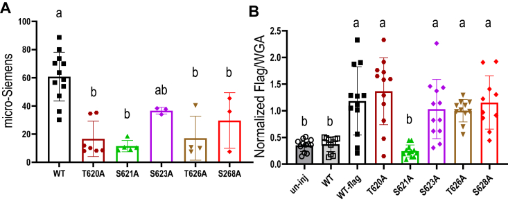 Figure 8. The conductance and surface protein expression of human SLC26A9, its Ala-substitutions in Ser/Thr-rich motif. A, the conductances calculated as the slope of I to V curves from voltage clamp experiments in Xenopus oocytes expressing SLC26A9 WT, T620A, S621A, S623A, T626A, and S628A ala-substitutions of SLC26A9 in standard ND96 solution. Individual points in bar graphs are individual oocyte experiments. Error bars represent mean ± SD. The results of the statistical analysis are indicated by lowercase letters, that is,. groups sharing letters are statistically similar, whereas those not sharing any letters are significantly different (p < 0.0001, one-way ANOVA with post hoc Tukey test for multiple comparisons). B, the normalized ratio of anti-Flag signal versus wheat germ agglutininsignal representing the relative surface protein expression level were displayed for triple-Flag–tagged SLC26A9 WT, its T620A, S621A, S623A, T626A, and S628A Ala-substitutions, and triple-Flag–tagged SLC26A9 Δloop. Staining of representative oocyte-cryosections with individual labeling are shown in Fig. 10. The uninjected oocytes and oocytes expression nontagged SLC26A9 (WT) were used as negative controls. Individual points in bar graphs are individual oocyte experiments. Error bars represent mean ± SD. The results of the statistical analysis are indicated by lowercase letters, that is, groups sharing letters are statistically similar, whereas those not sharing any letters are significantly different (p < 0.0001, one-way ANOVA with post hoc Tukey test for multiple comparisons). |