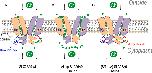 Figure 10. Role of disordered loop and S/T motif within STAS domain in the function of SLC26A9 (proposed dimer model). A, SLC26A9 dimer cartoon representing the human SLC26A9 cryo-EM structure (PDB: 7CH1) (19). In the WT SLC26A9 (SLC26A9-wt), the disordered loop (blue line on left, red-brown-green on right, colors in Fig. 7) within STAS domain forms a filter gate as a dimer for the Cl- channel activity. As noted by Chi and co-workers, the STAS domain of monomer 2 (purple) is below monomer 1 (light orange) and interact at TM8. The C terminus of monomer 2, also structurally interacts with TM8 of monomer 1 (see PDZ designation). The same interactions occur between monomer 2 and the STAS and C terminus of monomer 1. B, removal of the gate, results in greatly increased ionic flux (current and conductance). C, certain S/T variants in 620 to 628 subregions (red pentagons) are suggested to change the structure of this “filter gate” and thus alter ion permeation. In the absence of disordered loop (B) or the K/R region (red lines in A, C), we hypothesize that the channel is fully open and the Cl--HCO3- exchange activity is enhanced. STAS, sulfate transporter and anti-sigma. |