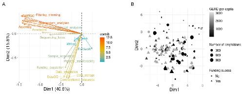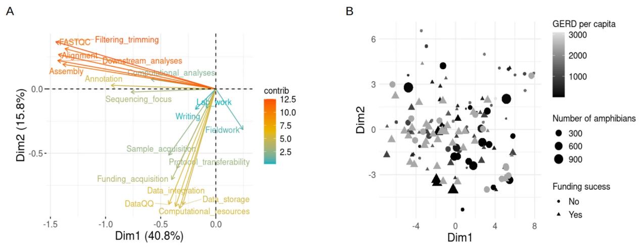 Fig. 5 Sequencing competencies and identified challenges of the members of the Amphibian Genomics Consortium (AGC). A Representation of the contribution of the AGC survey quantitative questions to the first dimensions after computing a principal component analysis (PCA). Bioinformatic competencies and perceived challenges were grouped into dimensions one and two, respectively. B Scatter plot showing PCA scores for each AGC survey respondent. Respondent answers are coded by the qualitative question about funding success for amphibian genomics projects using shape; number of amphibian species of the respondent main affiliation country by size, and gross domestic expenditure on R&D (GERD) per capita of the respondent main affiliation country by gray-scale color coded. Information about the number of amphibian species per country was obtained from AmphibiaWeb. GERD per capita was calculated using information from the UNESCO and World Bank websites from the information about the most recent year for each country