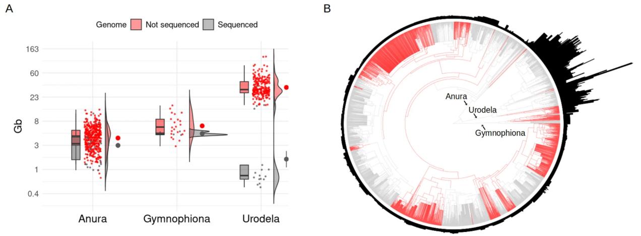 Fig. 2 Estimated genome size across amphibian orders in relation to sequenced genomes. A Combined box and density plot with raw data as points showing genome size of species with sequenced genome (gray color; genome sizes from NCBI genome assemblies) versus a subset of species without available genome assembly (red color; genome sizes from the Animal Genome Size Database) for each amphibian order. The y-axis is logarithmic transformed to facilitate visualization. Information about sequenced genomes and genome sizes was obtained from the NCBI Genome Browser, the Animal Genome Size database [13], and amphibian records from [12]. B Amphibian phylogenetic tree was adapted from [17], which includes species with genome size estimates from Genomes on a Tree (GoaT) [18]. Branches are color coded to represent families without any genomic record (in red) and families with at least a representative genome sequenced (in gray). Bar plots around the phylogeny indicate relative genome sizes