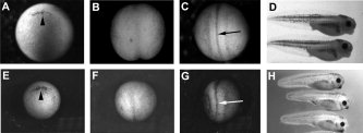 Figure 2. A comparison of embryonic development between X. laevis (AâD) and X. tropicalis (EâH). A,E: Vegetal view of early gastrula stage embryos, future dorsal is at the top. Arrowheads mark dorsal lip of the blastopore. The anterior of the embryo is toward the top in the next four panels. B,F: Dorsal view of neural plate stage embryos. The darkened stripe in the center of the embryo is the presumptive floorplate. C,G: Dorsal view of neural tube stage embryos. Arrows mark the region of neural-fold fusion. D,H: A lateral view of tadpole stage embryos; anterior is to the right. Magnification is the same at each stage.