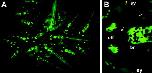 Figure 3. Pax-6/green fluorescent protein (GFP) transgenics show complex patterns of gene expression in later development, demarcating numerous subdomains within the brain, spinal cord, and sensory tissues. A: A group of Pax-6/GFP transgenic F2 siblings at late swimming tadpole stages (Nieuwkoop and Faber stage 43â45; Nieuwkoop and Faber, 1956). Note the consistency of GFP pattern and intensity between tadpoles. B: A high-magnification view of the head of a Pax-6/GFP primary transgenic tadpole at stage 46. Pax-6/GFP is expressed in the brain (br), eye (ey; GFP fluorescence is blocked in this image by the pigmented retina), and olfactory placodes (olf). Arrows point to the olfactory nerve (between olfactory placodes and brain) and optic nerve (between eye and brain), which show low, but detectable, levels of GFP fluorescence. Small clusters of cells on the skin, which may be part of the lateral line (Winklbauer, 1989), also express GFP.
