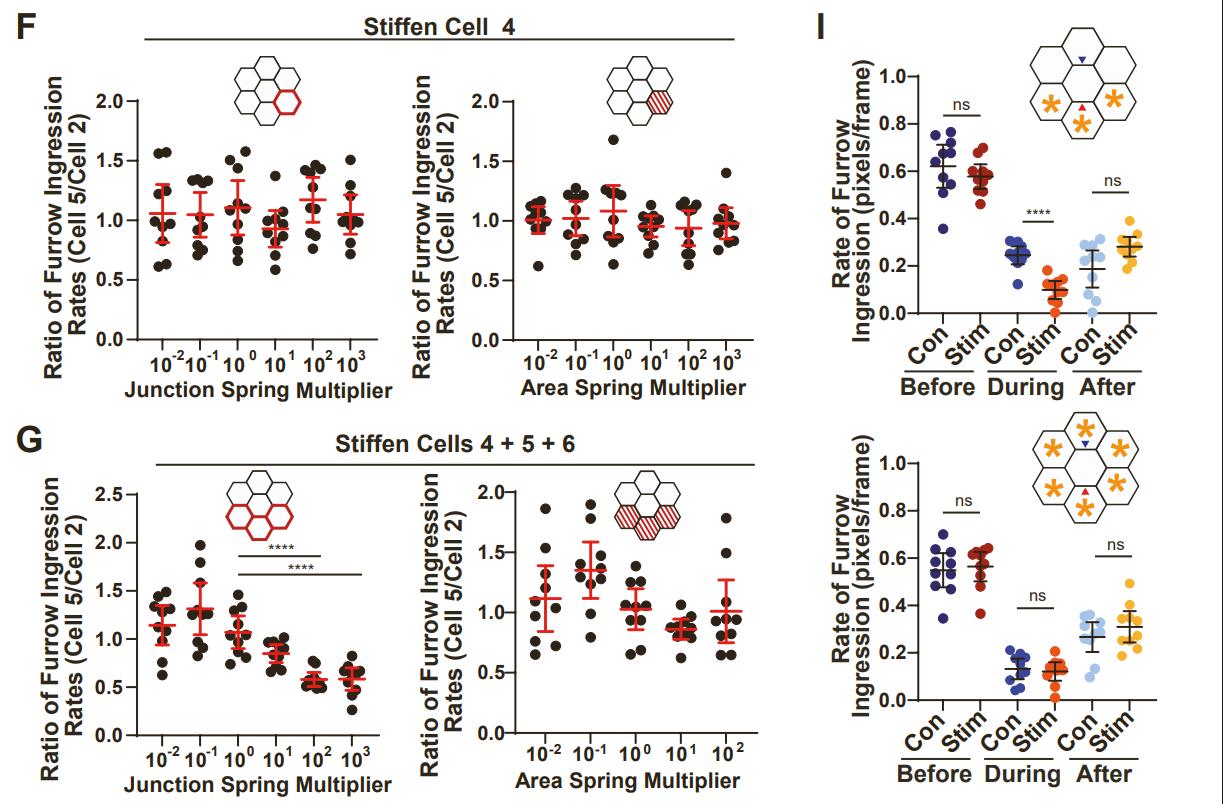 embryos. F) Ratio of furrow ingression rates with a single non-furrow neighbor (Cell 4) stiffened