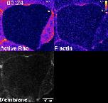 Video S2. Active Rho and F-actin accumulate near the cytokinetic furrow in neighbor cells, related to Figure 1C. Time-lapse confocal imaging of active Rho (GFP-rGBD, top left), F-actin (LifeAct-RFP, top right), and membrane (CellMask Deep Red, bottom left) in cells neighboring a dividing cell. Lookup table scales are indicated as shown. Time shown in minutes:seconds. Playback at 10fps. |