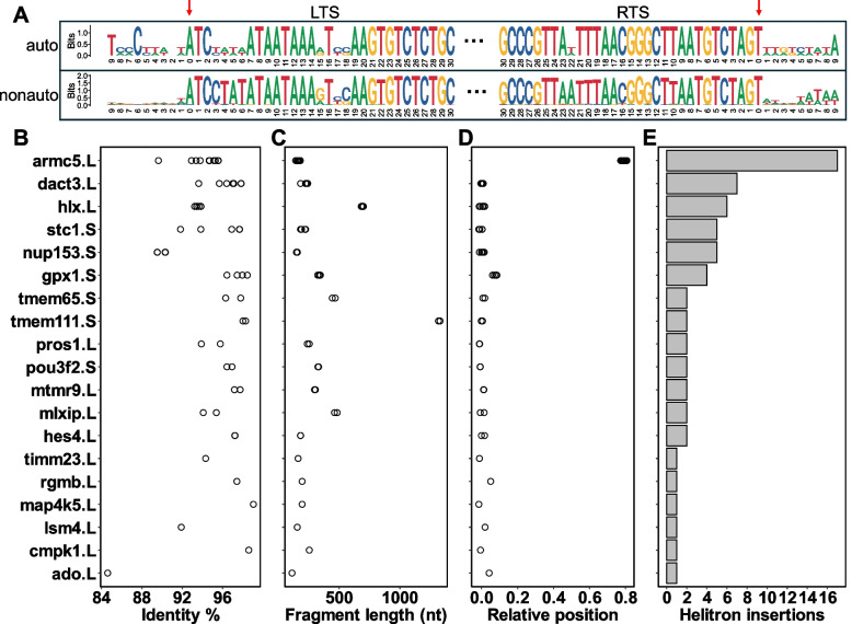 Fig. 2. Landscape of captured gene fragments within Helitron insertions. A Sequence logos of terminal sequences of LTS and RTS for nonautonomous Heli1Xen1 involving in gene capture events. Red arrows on top of the graph indicate the pattern of Helitron insertion sites. B Nucleotide identity between the donor gene and captured fragments. C Length of captured CDS fragments by Helitron sequences. D Relative start position of captured fragments within the donor gene, zero corresponds to the 5’ end of the CDS and 0.8 to the 3’ end. E Number of Helitron insertions that contain the gene fragments