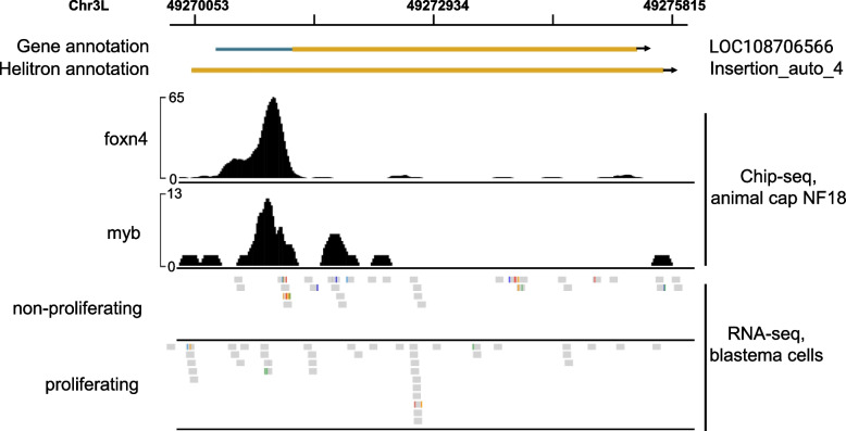 Fig. 3. Genomic landscape of the X. laevis Heli1Xen1 locus. This locus is annotated as gene LOC108706566 (the blue part indicates the 5’ UTR region, and the yellow part indicates the CDS region) by the NCBI annotation pipeline and as a Helitron insertion by HELIANO. The Chip-seq profile of animal cap NF18 shows significant foxn4 and myb Chip-seq peaks (TPM) at the 5’ end of this locus. The RNA-seq reads collected from blastema cells in either non-proliferating or proliferating status are uniquely mapped on this locus [22]