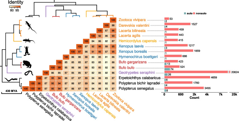 Fig. 5. Heli1Xen1 sequences in vertebrates. The heatmap (left) shows the pairwise identity of Heli1Xen1 RepHel consensus sequences from the different vertebrates where it was found. Each cell indicates the percentage of nucleotide identity. The bar plot (right) shows the number of autonomous and non-autonomous Heli1Xen1 insertions in each vertebrate genome. The phylograms on the left and the top of the heatmap are based on Time Tree database
