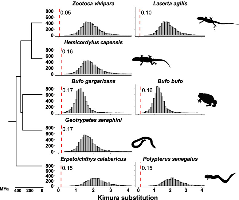Fig. 7. Histogram of the Kimura substitution distribution between orthologous genes of X. laevis and other vertebrates. The red dotted line indicates the Kimura substitutions between Heli1Xen1 from X. laevis and each vertebrate genome
