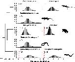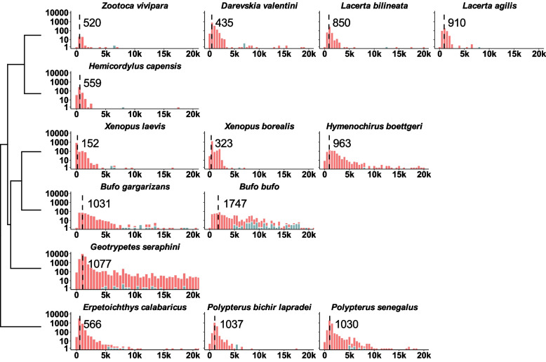 Fig. 8. Length distribution of Heli1Xen1 insertions in different species genomes. Non-autonomous insertions are shown in red, and autonomous insertions in blue. Species are ordered based on their phylogeny relationship. The X-axis represents the insertions' length (bp), and the Y-axis represents the number of insertions log10-adjusted. The dotted line represents the peaks of size distribution