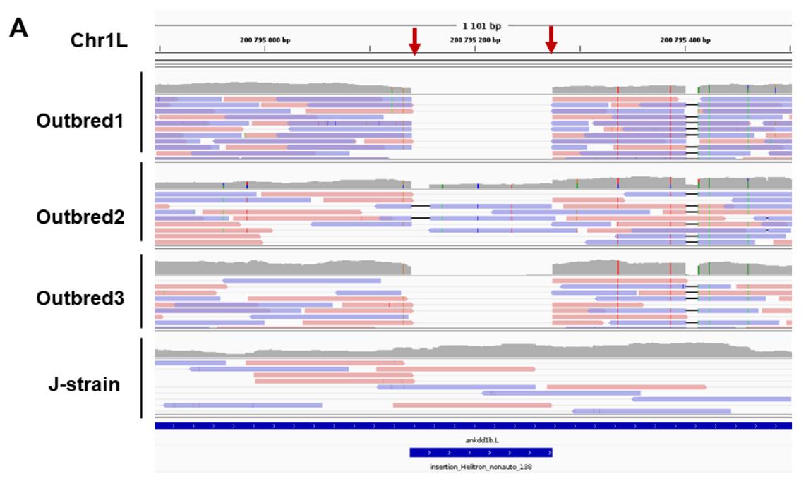 absence in outbred frogs and presence in J-strain (inbred). The reads for J-strain are