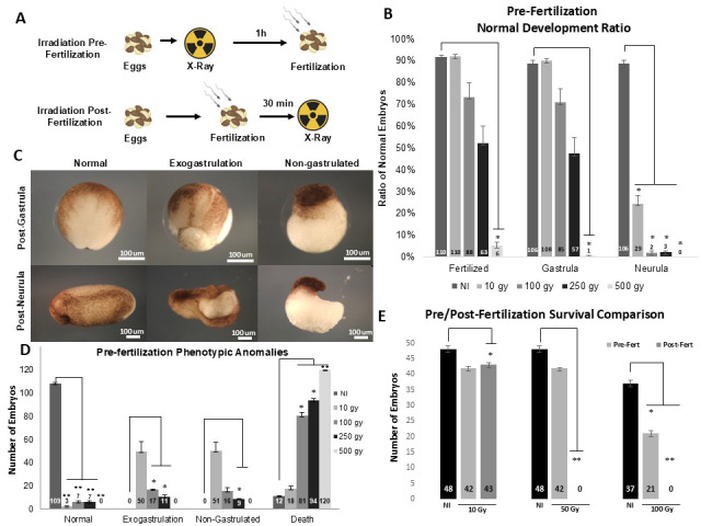 We examined the effects of X-ray irradiation on Xenopus laevis , focusing on pre- and post-fertilization exposure. We applied X-ray doses of 10, 50, 100, 250, and 500 Gy. Fifty percent of the 360 eggs irradiated at 250 Gy failed to fertilize, while fertilized eggs developed normally until the gastrula stage. Doses ranging from 10 to 250 Gy caused developmental anomalies. High mortality rates were observed at doses of 100 to 500 Gy. Post-fertilization irradiation at 50 to 100 Gy resulted in 100% lethality, while exposure to 10 Gy led to only 13% lethality, although both exposure levels produced similar types of developmental anomalies compared to pre-fertilization irradiation. This study highlights how the timing and intensity of exposure critically affect embryo viability, especially during the sensitive stages of fertilization and gastrulation. We establish the necessary and sufficient dosage to further investigate the molecular mechanisms of X-ray damage to DNA and protein.