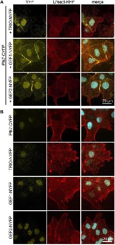 Fig. 3. TRIO interacts with Ptk7 in NC cells. (A) NC explants were injected with 100 pg Ptk7-CYFP RNA in combination with 100 pg TRIO-NYFP DNA, 100 pg GEF1-NYFP RNA or 100 pg GEF2-NYFP RNA together with 200 pg H2B-CFP RNA and 300 pg lifeact-RFP RNA in one blastomere at the two-cell stage. Representative results of at least three independent experiments are shown. YFP signal indicates an interaction between Ptk7 and TRIO at NC cell-cell contacts. YFP and CFP signals cannot be distinguished by the imaging system, so nuclear labeling (H2B-CFP) is also visible in the YFP channel. Scale bar: 20 µm. (B) Negative control for the bimolecular fluorescence complementation assay. NC explants were injected with the indicated constructs in combination with H2B-CFP RNA and lifeact-RFP RNA. No YFP signal was detected at NC cell-cell contacts when the NYFP and CYFP constructs were expressed alone. Scale bar: 20 µm. |