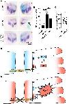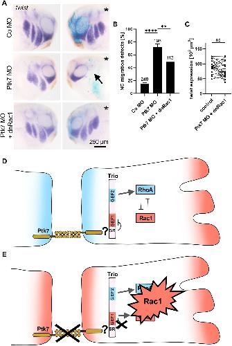 Fig. 7. dnRac1 restores NC migration in Ptk7 morphants. (A-C) Embryos were injected with 5 ng control MO or 5 ng Ptk7 MO in combination with 50 pg lacZ RNA as lineage tracer in one blastomere at the eight-cell stage. Co-injection of 10 pg dnRac1 DNA restored NC migration in Ptk7 morphants. (A) NC cell migration was analyzed at stage 26 by twist in situ hybridization. The injected side is marked with an asterisk. NC cell migration defects are indicated by an arrow. Scale bar: 250 µm. (B) Graph summarizing the percentage of embryos with NC migration defects from at least three independent experiments. The number of embryos is indicated for each column. Data are mean±s.e.m. ****P<0.0001, **P<0.01 (one-way ANOVA). (C) Graph showing the measured area of twist expression in the branchial arches of 20 randomly selected embryos of the rescue condition. The twist expression area of the uninjected side (control) is compared to the injected side of the embryo. ns, not significant (paired t-test). (D) At cell-cell contacts, Ptk7 interacts with Trio, thereby inhibiting its GEF1 activity. This is likely achieved by Ptk7 contributing to the autoinhibition of the GEF1 domain, which is mediated by the spectrin repeat domain (SR) of Trio. Thus, the activity of Trio is limited to activation of RhoA, thereby supporting contact inhibition of locomotion. (E) Conversely, loss of Ptk7 function releases this block on the GEF1 domain and leads to hyperactivation of Rac1. Models in D and E were generated using Procreate software. |