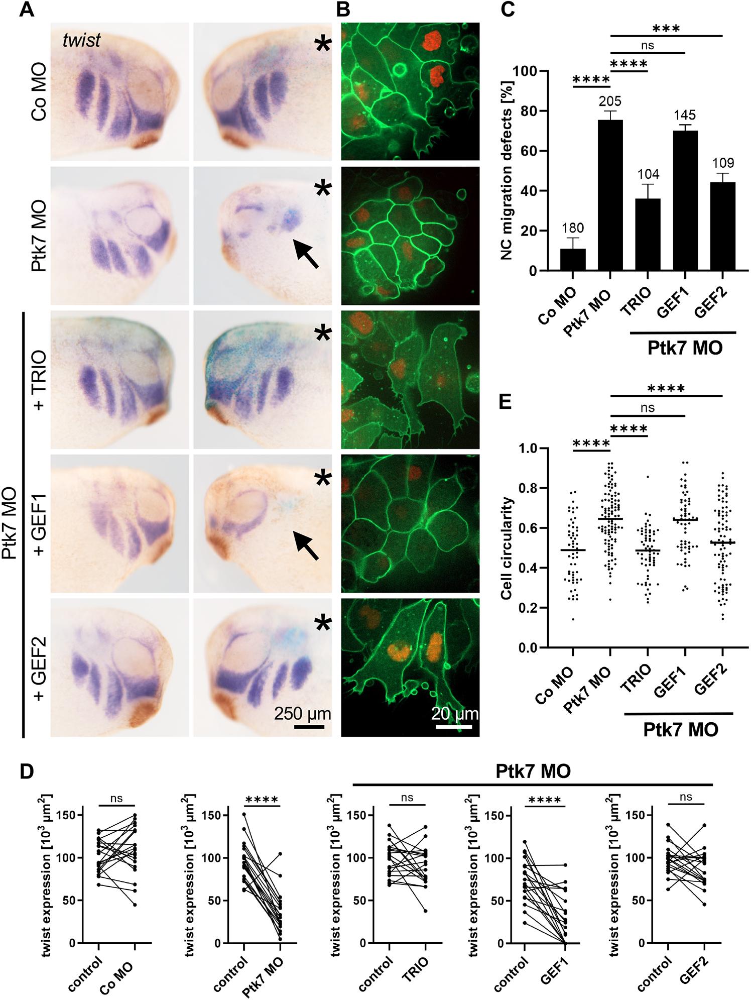 Fig. 1. The Trio GEF2 domain rescues the Ptk7 morphant NC migration defect. (A,B) Two-cell stage embryos were injected with 6.5-7.5 ng Ptk7 MO or a control MO in combination with 75 pg lacZ RNA (A) or 50 pg mbGFP RNA together with 250 pg H2B-mcherry RNA (B) as lineage tracer. Co-injection of 150 pg TRIO DNA and 100 pg GEF2 RNA, but not 100 pg GEF1 RNA, restored NC cell migration in vivo and protrusion formation in vitro of Ptk7 morphants. (A) NC cell migration was analyzed at stage 26 by twist in situ hybridization. Asterisks mark the injected side. Arrows indicate NC migration defects. Scale bar: 250 µm. (B) NC cells were explanted at stage 18, cultured on fibronectin-coated slides and analyzed by time-lapse microscopy. Scale bar: 20 µm. (C) Graph summarizing the percentage of embryos with NC migration defects of at least three independent experiments. The total number of embryos is indicated for each column. Data are mean±s.e.m. ****P<0.0001, ***P<0.001; ns, not significant (one-way ANOVA). (D) Quantification of the twist in situ hybridization shown in A. Graphs presenting the measured area of twist expression of 20 randomly selected embryos per condition. The three graphs on the right depict the results of embryos co-injected with Ptk7 MO and the respective rescue constructs. The twist expression of the uninjected side (control) is compared to that of the injected side of the embryo. ****P<0.0001; ns, not significant (paired t-test). (E) A graph plotting cell circularity of explanted NC cells shown in B. Number (n) of analyzed cells: Co MO=57, Ptk7 MO=111, Ptk7 MO+TRIO=66, Ptk7 MO+GEF1=63 and Ptk7 MO+GEF2=92. The median is plotted as a line. ****P<0.0001; ns, not significant (Kruskal–Wallis test).