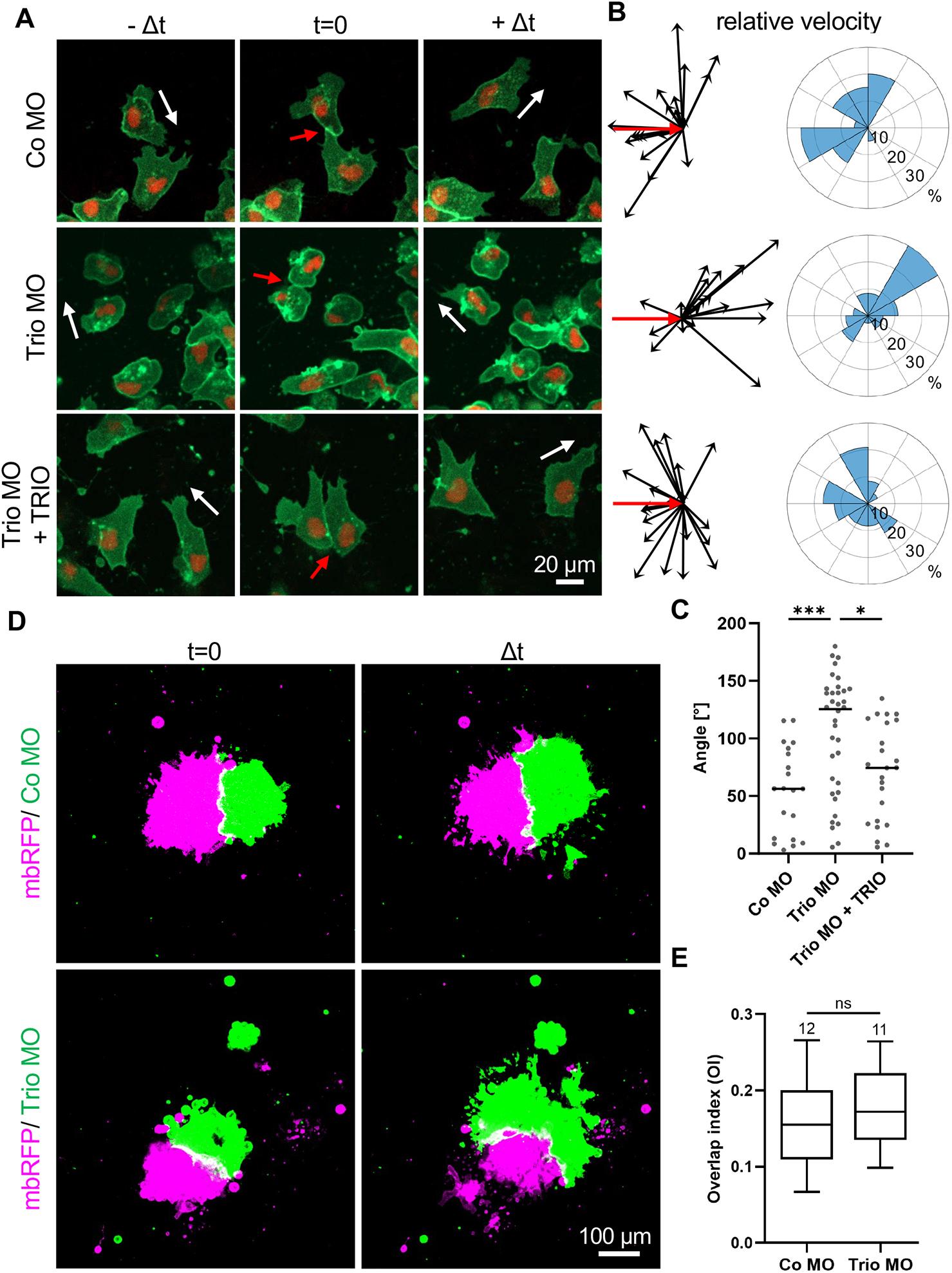 Fig. 4. Trio is required for contact inhibition of locomotion. (A-C) Embryos were injected with 5-6 ng Trio MO or control MO together with 100 pg mbGFP RNA and 200 pg H2B-mCherry in one blastomere at the two-cell stage. For rescue experiments, 150 pg TRIO DNA was co-injected. NC cells were explanted at stage 18 and imaged after 4 h of cultivation, when the NC cells had started to migrate as single cells. (A) Single NC cells before (−Δt), during (t=0) and after (+Δt) collision. Scale bar: 20 µm. White arrows indicate the direction of migration. Red arrows indicate cell-cell collisions. (B) Relative velocity vectors (black) with initial velocity vector (red) of 20 representative tracked NC cells are shown (left). Rose plots (right) showing the relative velocity vector distribution of all tracked NC cells. Number (n) of analyzed NC cells: Co MO=20, Trio MO=36, Trio MO+TRIO=24. (C) Graph presenting the angles between the velocity vectors and the initial vector. Velocity vectors below the initial vector have been horizontally flipped so that all angles are between 0° and 180° for comparison. *P<0.05, ***P<0.001 (Kruskal–Wallis test). (D,E) For confrontation assay, embryos were injected with either 100 pg mbRFP RNA alone or 50 pg mbGFP together with 4 ng MO in one blastomere at the eight-cell stage. Explanted NC cells were co-cultured and analyzed by time lapse microscopy. (D) Confronted explants at the start of the experiment (time point t=0, left). Confronted explants at the time point of maximum invasion (Δt, right). Scale bar: 100 µm. (E) Box plot showing the overlap index (OI) at the time point of maximal invasion (Δt) for three independent experiments. The number of analyzed confrontation events is indicated for each column. The box extends from the 25th to the 75th percentile, with whiskers indicating the maximum 1.5×IQR. The median is plotted as a line inside the box. ns, not significant (P>0.05; Mann–Whitney test). |