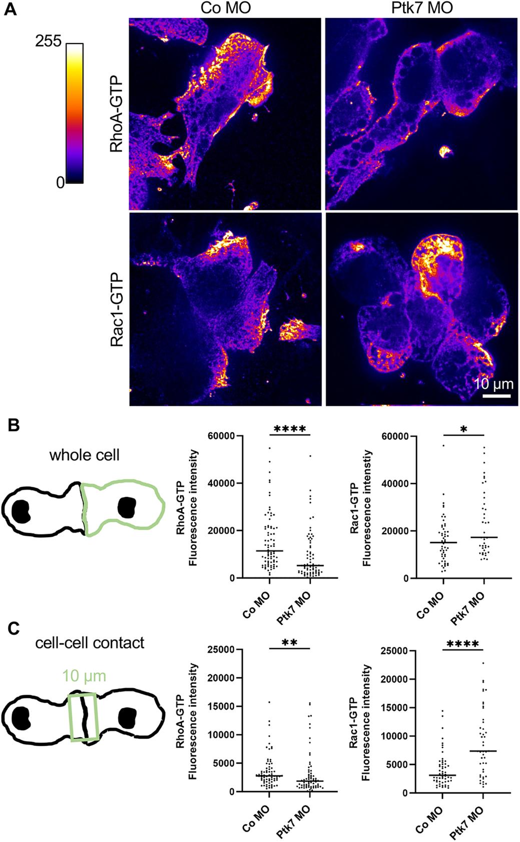 Fig. 6. Loss of Ptk7 function leads to downregulation of RhoA but upregulation of Rac1. (A) Embryos were injected with 7.5 ng Ptk7 MO or control MO, together with 100 pg mbGFP RNA as lineage tracer in one blastomere at the two-cell stage. NC cells were explanted at stage 18 and fixed after 2 h of cultivation. Antibody staining against RhoA-GTP or Rac1-GTP were performed. The ‘Fire’ lookup table of ImageJ was applied. Scale bar: 10 µm. (B) Quantification of the antibody signal of the whole cell. The CTCF is plotted in the graphs. Number (n) of analyzed NC cells of at least three independent experiments: RhoA-GTP: Co MO=77, Ptk7 MO=73; Rac1-GTP: Co MO=52, Ptk7 MO=40. *P<0.05, ****P<0.0001 (Mann–Whitney test). (C) Fluorescence intensity at NC cell-cell contact sides. A rectangle with a width of 10 µm was placed over the entire length of the contact (see schematic). Graphs plotting the CTCF of the signal inside the square. Number (n) of analyzed cell-cell contacts of at least three independent experiments: RhoA-GTP: Co MO=72, Ptk7 MO=70; Rac1-GTP: Co MO=54, Ptk7 MO=46. **P<0.01, ****P<0.0001 (Mann–Whitney test). |