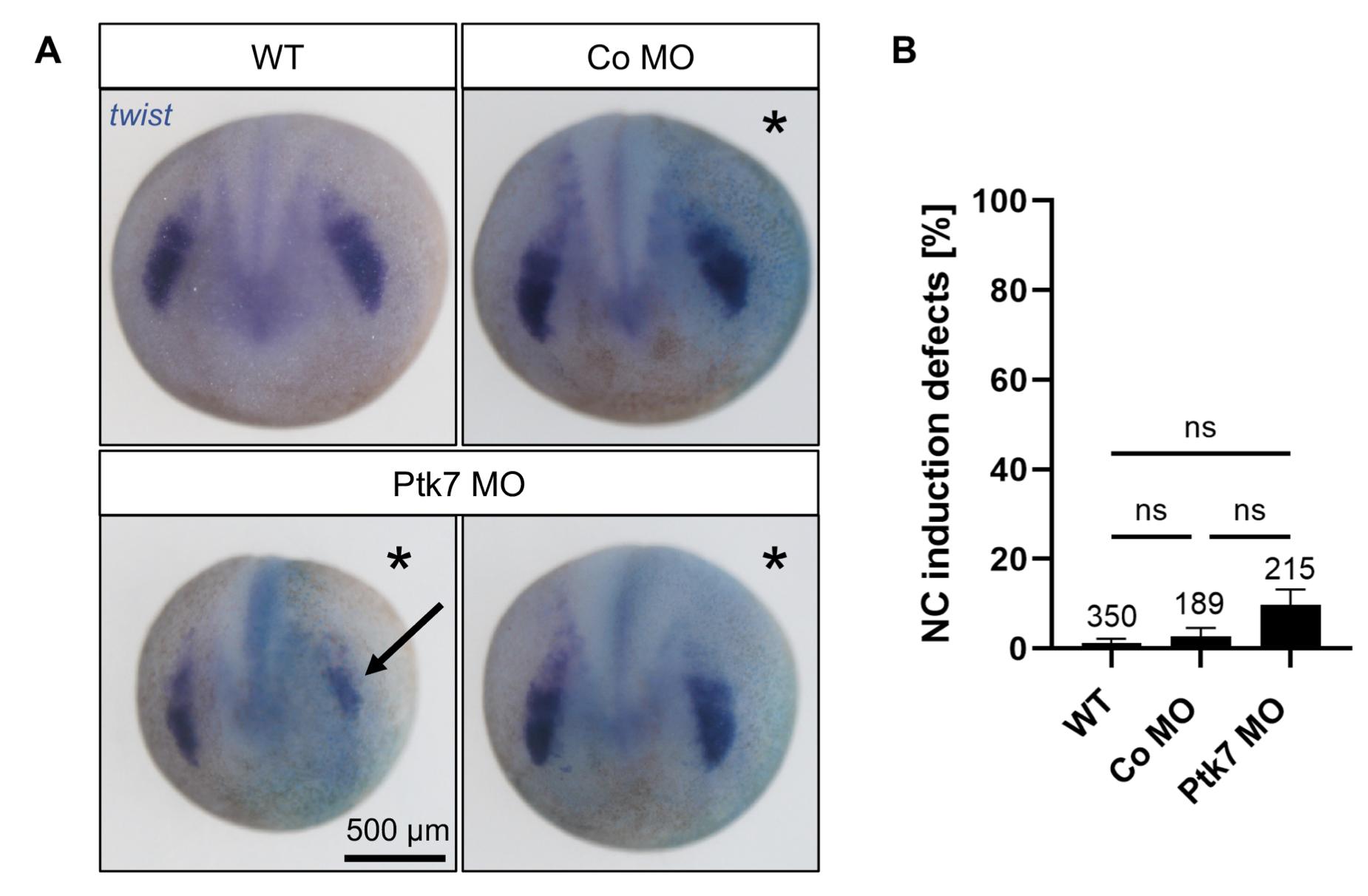Fig. S1. Ptk7 loss-of-function does not affect NC induction. Two-cell stage embryos were injected with 7.5 ng Ptk7 MO or a control MO in combination with 75 pg lacZ RNA as lineage tracer. (A) NC cell induction was analyzed at stage 17/18 by twist in situ hybridization. Asterisks mark the injected side. Arrow indicates NC induction defect. Scale bar: 500 μm. (B) Graph showing NC induction defects of four independent experiments. The total number of embryos is indicated for each column. Data are mean ±s.e.m., ns = not significant (one- way ANOVA). |