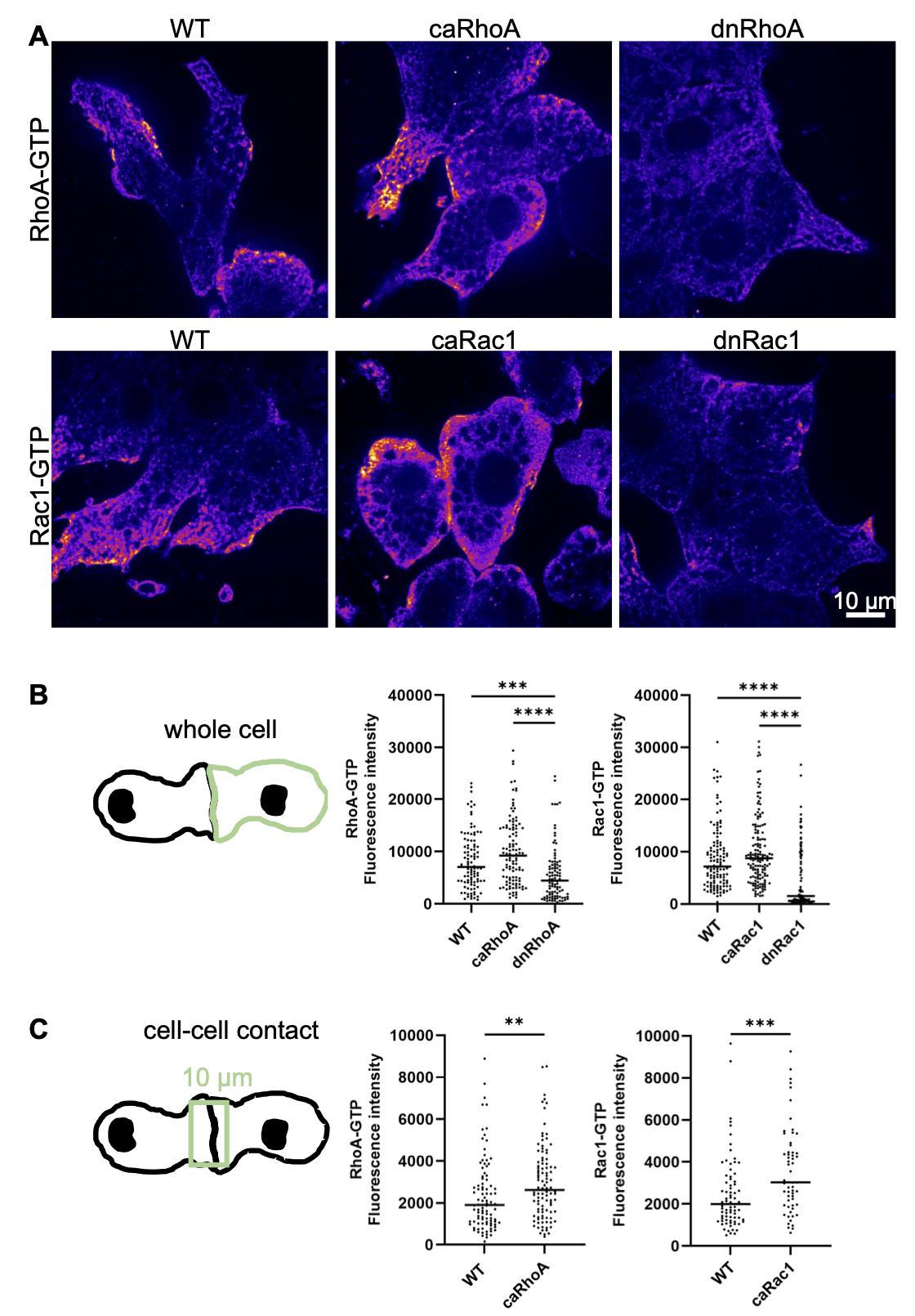 Fig. S5. Positive and negative controls for the detection of active RhoA and Rac1 by antibody staining. (A) Embryos were injected with 10-20 pg caRhoA, dnRhoA, caRac1, dnRac1 DNA in combination with 200 pg mbRFP RNA as lineage tracer in one blastomere at the 8-cell stage. NC cells were explanted at stage 18 and fixed after three hours of cultivation. An antibody staining against RhoA-GTP or Rac1-GTP was performed. The ’Fire’ lookup table of ImageJ was applied. Scale bar: 10 μm. (B) Quantification of the antibody signal of the whole cell. The CTCF is plotted, the median is indicated as a line. ****p<0.0001, ***p<0.001 (Kruskal-Wallis test). (C) Fluorescence intensity at NC cell-cell contact sides. The CTCF was determined in a square with a width of 10 μm that was placed over the entire length of the cell-cell contact (see cartoon). The median CTCF of at least three independent experiments is blotted as a line. **p<0.01, ***p<0.001 (Mann-Whitney test). |