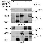 Fig. S3. The Trio GEF domains interact with Ptk7 in HEK293 cells. HEK293 cells were transfected as indicated and immunoprecipitations were performed using an anti-HA antibody. Co-immunoprecipitated proteins are shown in the upper panel, immunoprecipitated proteins in the middle panel and cell lysates in the bottom panel. Antibodies used for Western blotting and molecular weights (kDa) are indicated on the right. Representative results of at least three independent experiments are shown. |