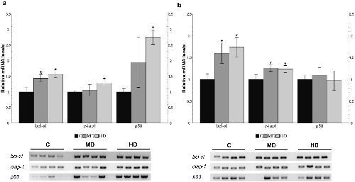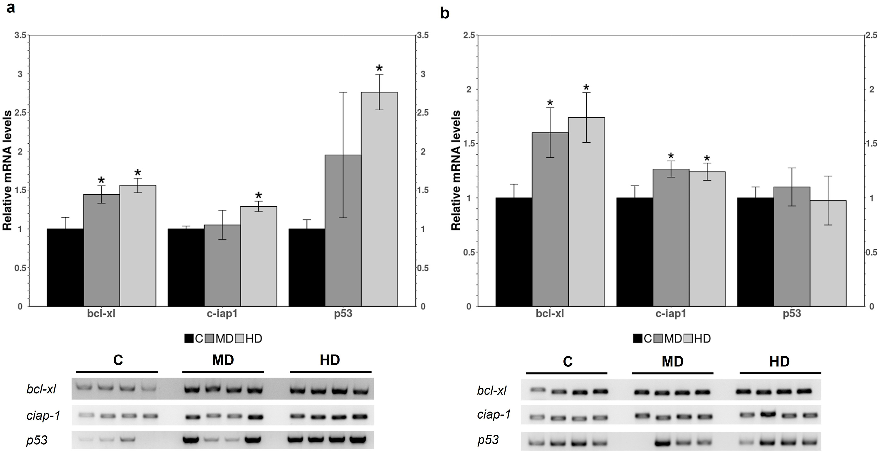 Fig. 5. Relative mRNA transcript expression levels of NF-κB downstream targets c-iap1, bcl-xl, and p53 in X. laevis (a) liver and (b) skeletal muscle during control (C), medium dehydration (MD), and high dehydration (HD) as determined by RT-PCR. Data are mean ± SEM, n = 3–4 independent trials on tissue samples from different animals. Statistical significance was determined using a one-way ANOVA with a Dunnett's post hoc test, where “∗” denotes significantly different from control values (p < 0.05). Representative PCR product bands visualized on a 1 % agarose gel are shown below each bar chart.