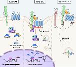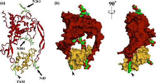 Figure 2. Crystal structure of the Wnt-Frizzled complex. Wnt adopts a “thumb and index” structure that contacts Frizzled ectodomain on two opposite sides. (a) Ribbon models of xWnt8 (red) and Frizzled 8 cysteine rich domain (yellow). The palmitoleic acid moiety (PAM) and asparagine-linked glycans are drawn as sticks, with the following atom color code: green = carbon; red = oxygen; blue = nitrogen. The black arrowhead points at the appended PAM extending in a zigzag pattern from Ser187 of the xWnt8 N-terminal domain. Black arrows indicate Asn104-linked glycan (two N-acetylglucosamine and two mannose residues), Asn263-linked glycan (two N-acetylglucosamine residues and one mannose residue) on xWnt8; and Asn49-linked glycan (two N-acetylglucosamine residues) on Frizzled CRD. (b) Surface representation of the Wnt-Fzd complex, ‘face-on’ and ‘side-on’ (after a 90 degrees rotation). Note how the palmitoleic acid (arrowheads) fits into the hydrophobic groove of Frizzled CRD. The images were created by uploading the crystallographic data of xWnt8-Fzd8 complex deposited on Protein Data Bank (PDB ID 4F0A; https://www.rcsb.org/) (Janda et al., 2012), to the web-based online tool EzMol (http://www.sbg.bio.ic.ac.uk/ezmol/) (Reynolds et al., 2018) |