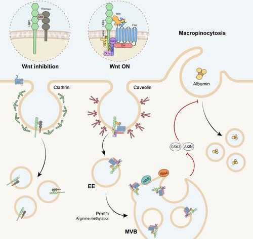Figure 4. Endocytosis regulates Wnt signaling. Upon activation of the Wnt pathway, the signalosome (formed by the ligand–receptor complex, and associated proteins) is rapidly internalized through caveolar endocytosis. Early endosome (EE) vesicles containing the signalosome fuse and mature into multivesicular bodies (MVB), dragging GSK3 and Axin into the intraluminal vesicles of the MVB. Several endosomal proteins, such as the ESCRT machinery (including HRS and VPS4), are required for this process. Prmt1 and arginine methylation are also key regulators of GSK3 sequestration into MVBs. On the other hand, endocytosis can also be utilized to dampen Wnt signal. An example is Dkk1 binding to Lrp6 and the transmembrane protein Kremen, which promote Lrp6 clearance from the plasma membrane through clathrin-mediated endocytosis. Wnt can also mediate nutrient uptake, by regulating macropinocytosis. GSK3 and Axin normally repress micropinocytosis; however, when Wnt signaling is turned on, their sequestration into MVBs allows for sustained macropinocytic activity |