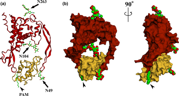 FIGURE 2. Crystal structure of the Wnt‐Frizzled complex. Wnt adopts a “thumb and index” structure that contacts Frizzled ectodomain on two opposite sides. (a) Ribbon models of xWnt8 (red) and Frizzled 8 cysteine rich domain (yellow). The palmitoleic acid moiety (PAM) and asparagine‐linked glycans are drawn as sticks, with the following atom color code: green = carbon; red = oxygen; blue = nitrogen. The black arrowhead points at the appended PAM extending in a zigzag pattern from Ser187 of the xWnt8 N‐terminal domain. Black arrows indicate Asn104‐linked glycan (two N‐acetylglucosamine and two mannose residues), Asn263‐linked glycan (two N‐acetylglucosamine residues and one mannose residue) on xWnt8; and Asn49‐linked glycan (two N‐acetylglucosamine residues) on Frizzled CRD. (b) Surface representation of the Wnt‐Fzd complex, ‘face‐on’ and ‘side‐on’ (after a 90 degrees rotation). Note how the palmitoleic acid (arrowheads) fits into the hydrophobic groove of Frizzled CRD. The images were created by uploading the crystallographic data of xWnt8‐Fzd8 complex deposited on Protein Data Bank (PDB ID 4F0A; https://www.rcsb.org/) (Janda et al., 2012), to the web‐based online tool EzMol (http://www.sbg.bio.ic.ac.uk/ezmol/) (Reynolds et al., 2018) |