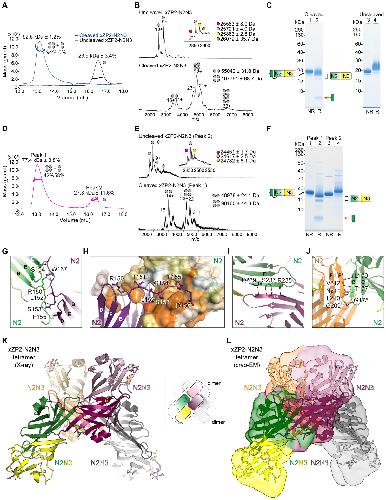 (K) Crystal structure of cleaved xZP2-N2N3. Right inset, xZP2-N2N3 tetramer scheme.