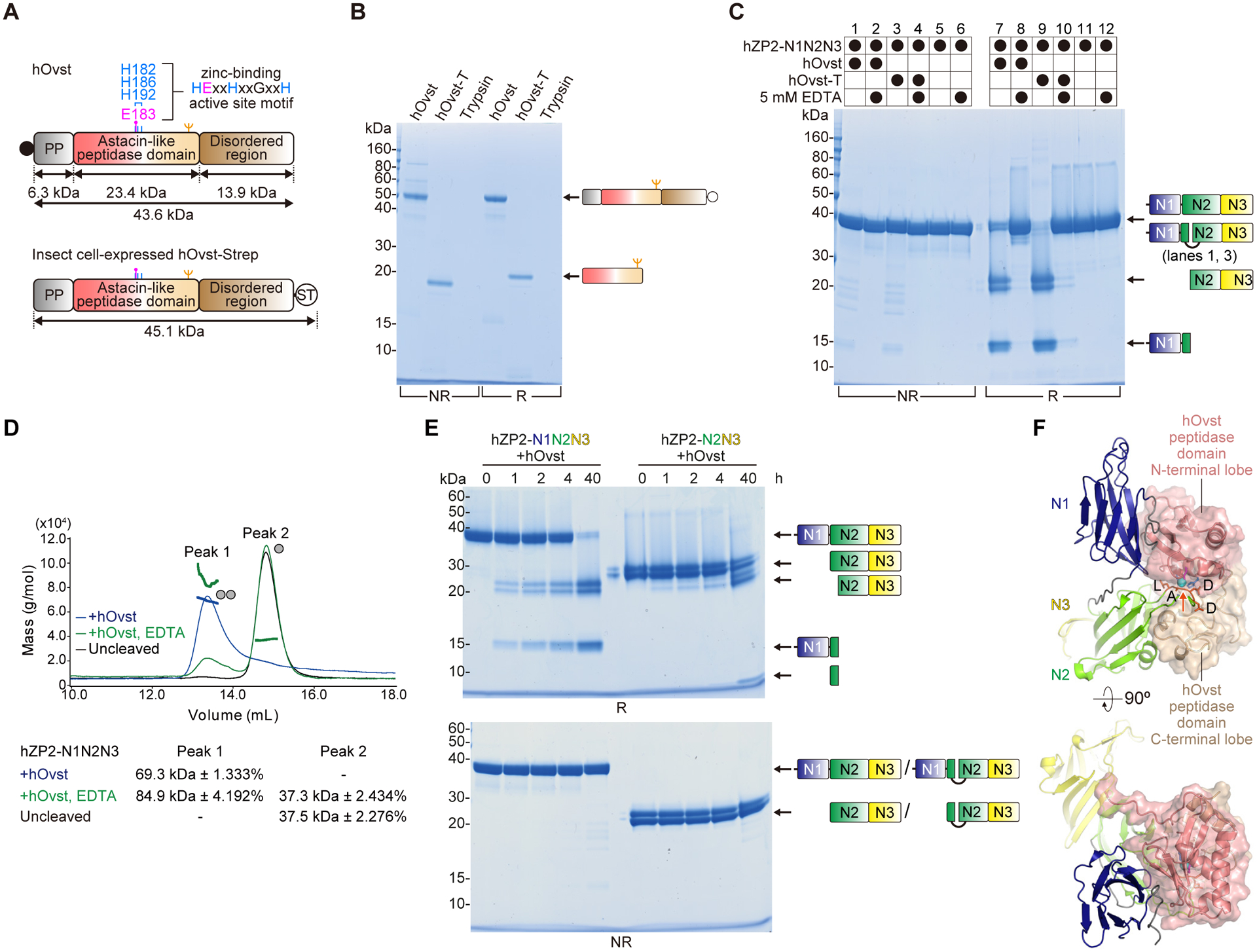 (C) Cleavage of hZP2-N1N2N3 with hOvst or hOvst-T. Note how EDTA inhibits the Zn2+-dependent proteolytic activity of hOvst.
