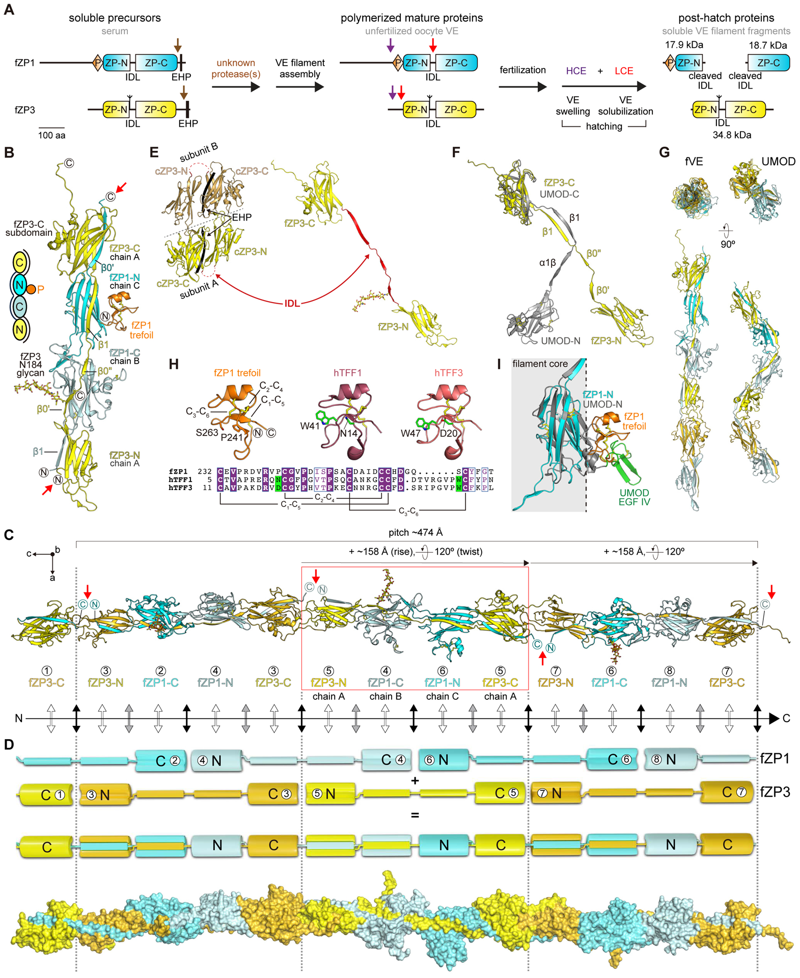 (A) Domain structure of medaka VE major subunits fZP1 and fZP3 in their soluble precursor (left), polymerized (center) and hatching enzyme-digested (right) forms. Vertical arrows indicate the specific recognition sites of the proteases regulating VE subunit polymerization and hatching. Note that, because fZP1 and fZP3 are secreted into the serum by the liver, their precursors lack a C-terminal transmembrane domain.
