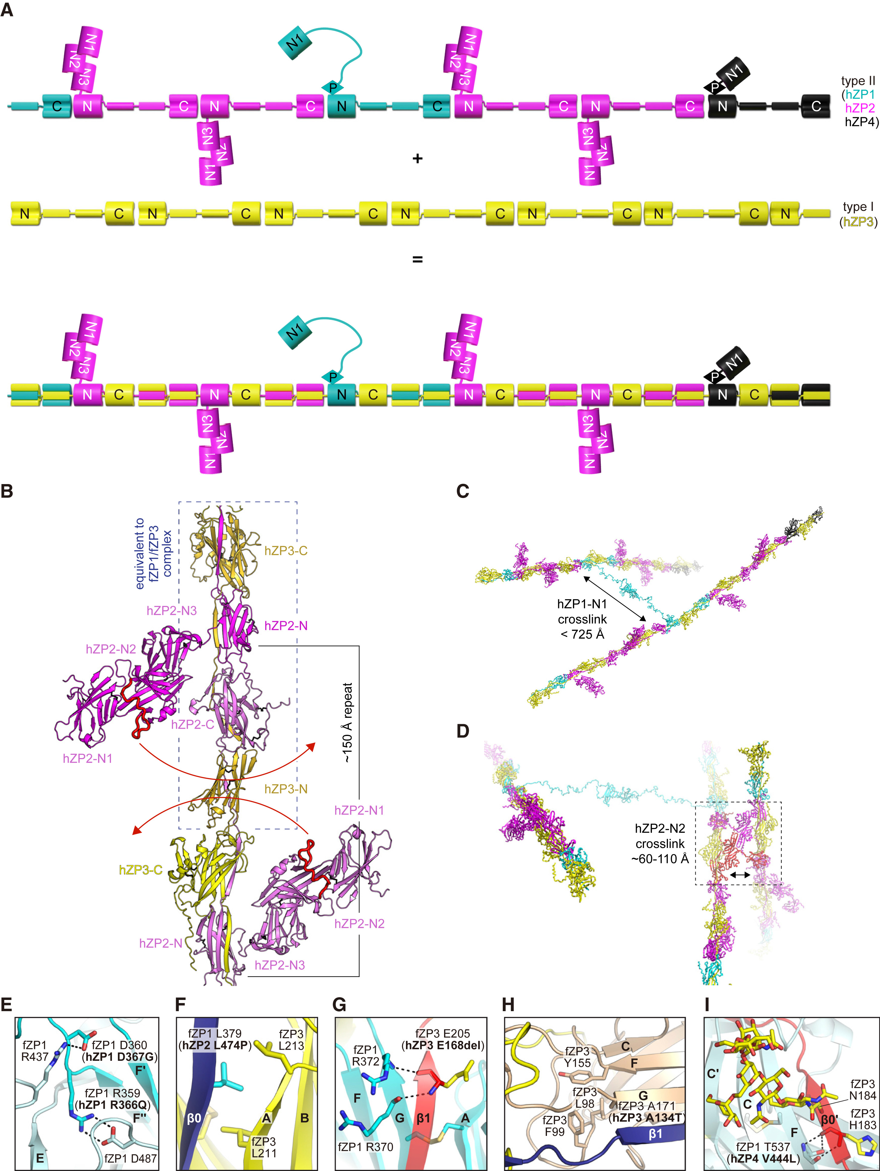 (E–I) Close-up views of fZP1/fZP3 residues corresponding to positions affected by human ZP gene mutations associated with infertility.