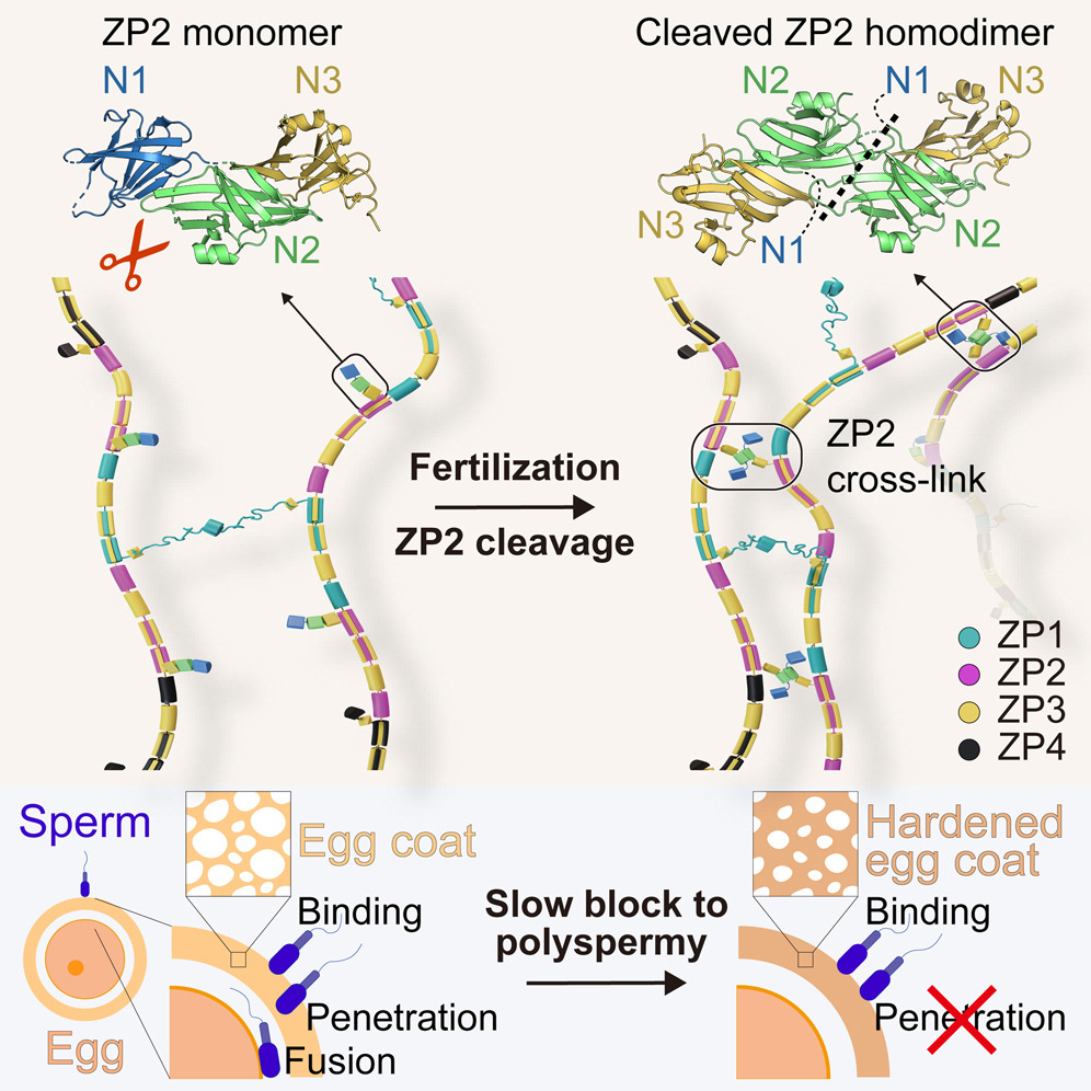 Figure 7. Modeling of human ZP filaments, before and after post-fertilization cleavage of ZP2, and infertility-associated mutations