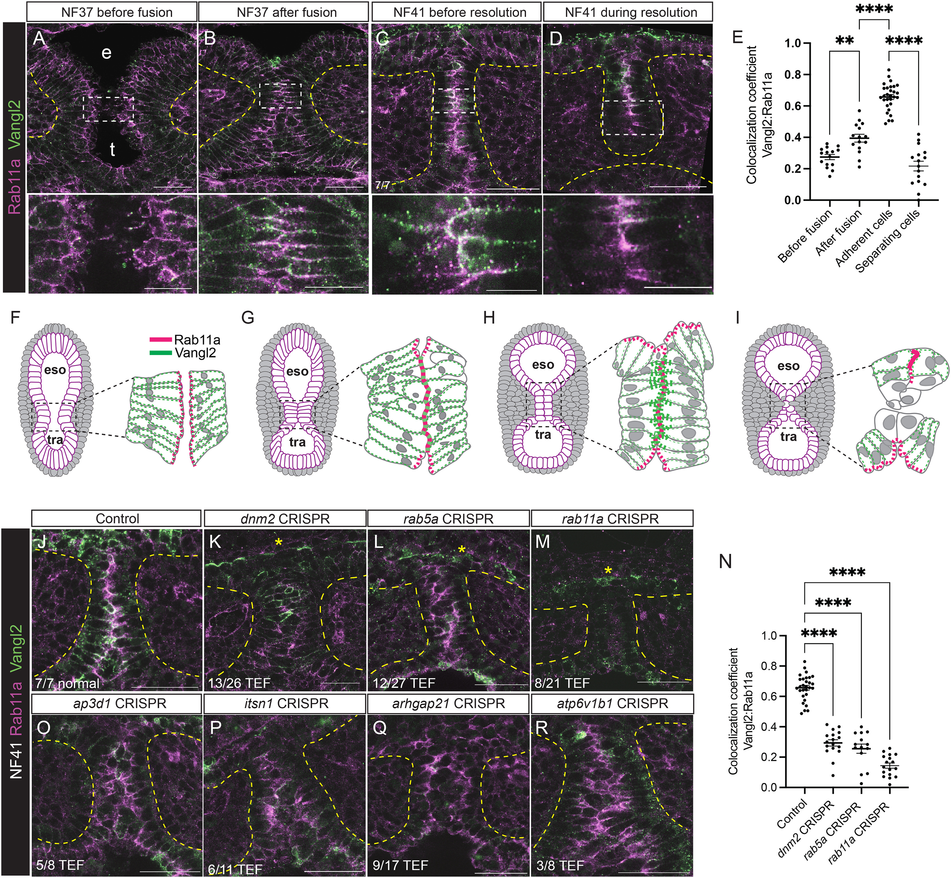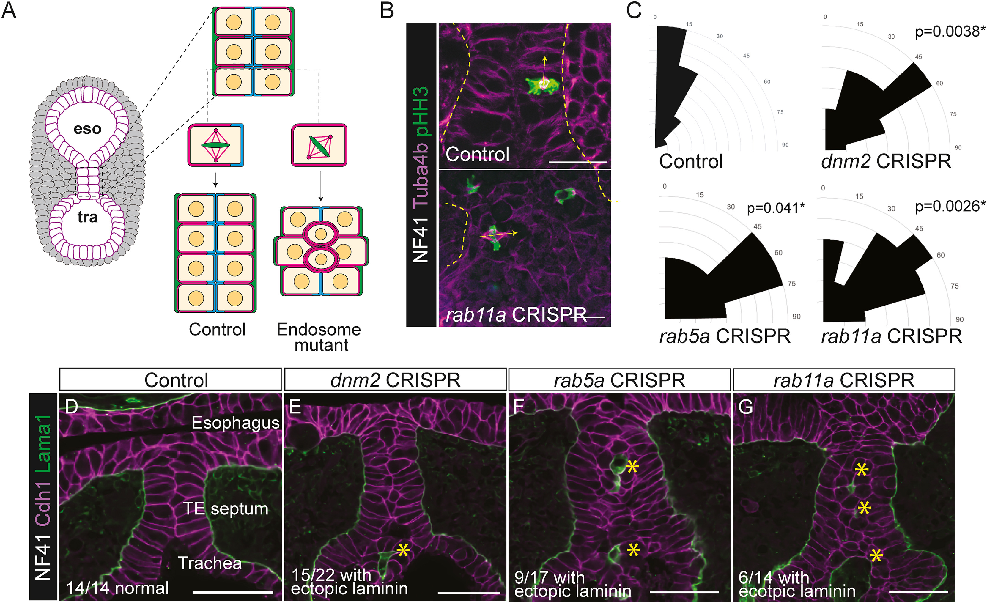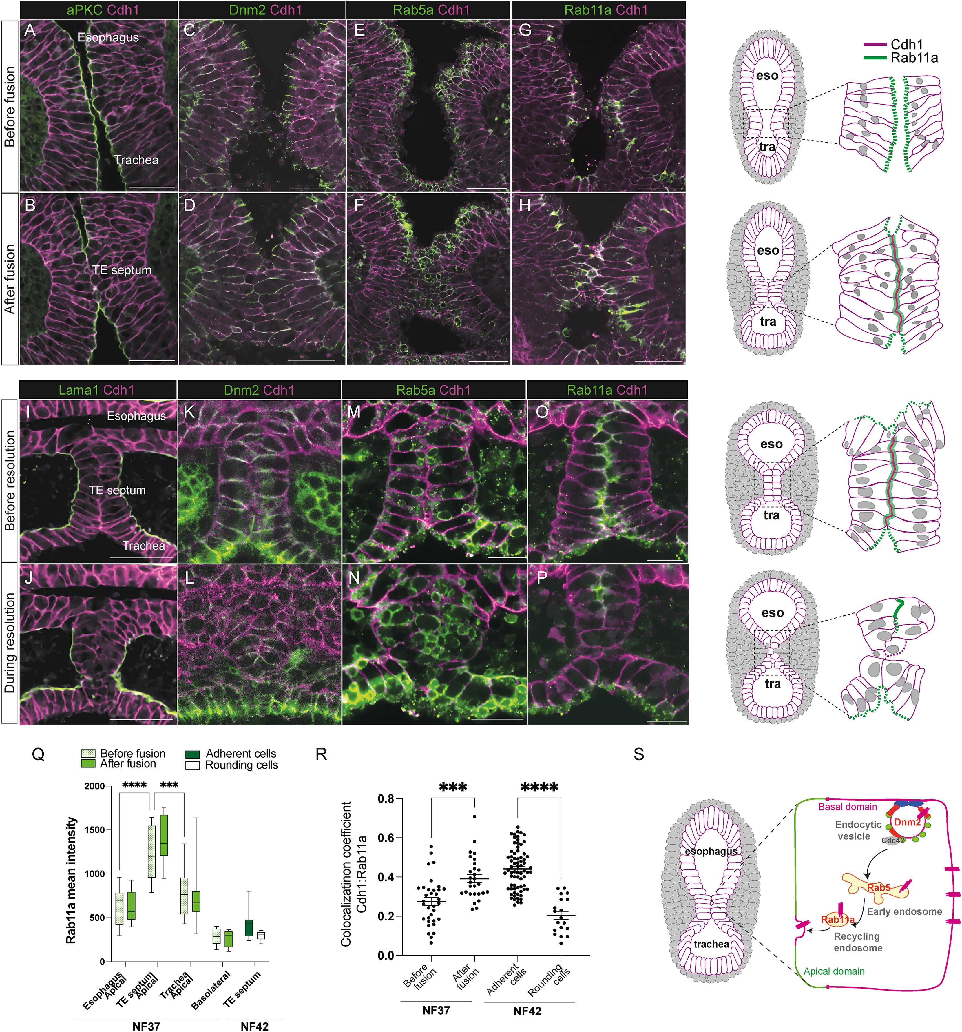 Disruptions in foregut morphogenesis can result in life-threatening conditions where the trachea and esophagus fail to separate, such as esophageal atresia (EA) and tracheoesophageal fistulas (TEFs). The developmental basis of these congenital anomalies is poorly understood, but recent genome sequencing reveals that de novo variants in intracellular trafficking genes are enriched in EA/TEF patients. Here, we confirm that mutation of orthologous genes in Xenopus disrupts trachea-esophageal separation similar to EA/TEF patients. The Rab11a recycling endosome pathway is required to localize Vangl-Celsr polarity complexes at the luminal cell surface where opposite sides of the foregut tube fuse. Partial loss of endosomal trafficking or Vangl-Celsr complexes disrupts epithelial polarity and cell division orientation. Mutant cells accumulate at the fusion point, fail to relocalize cadherin, and do not separate into distinct trachea and esophagus. These data provide insights into the mechanisms of congenital anomalies and general paradigms of tissue fusion during organogenesis.
