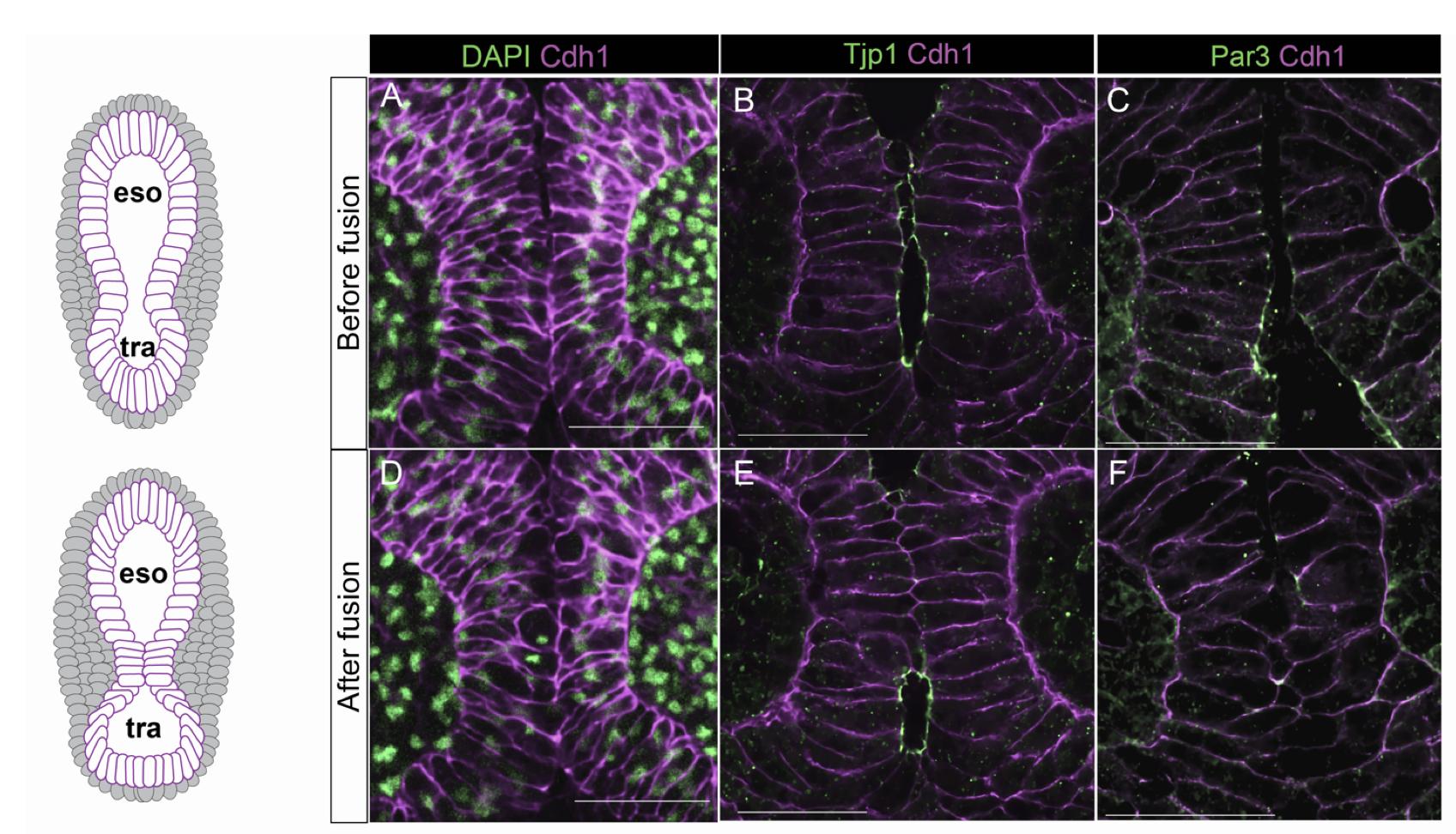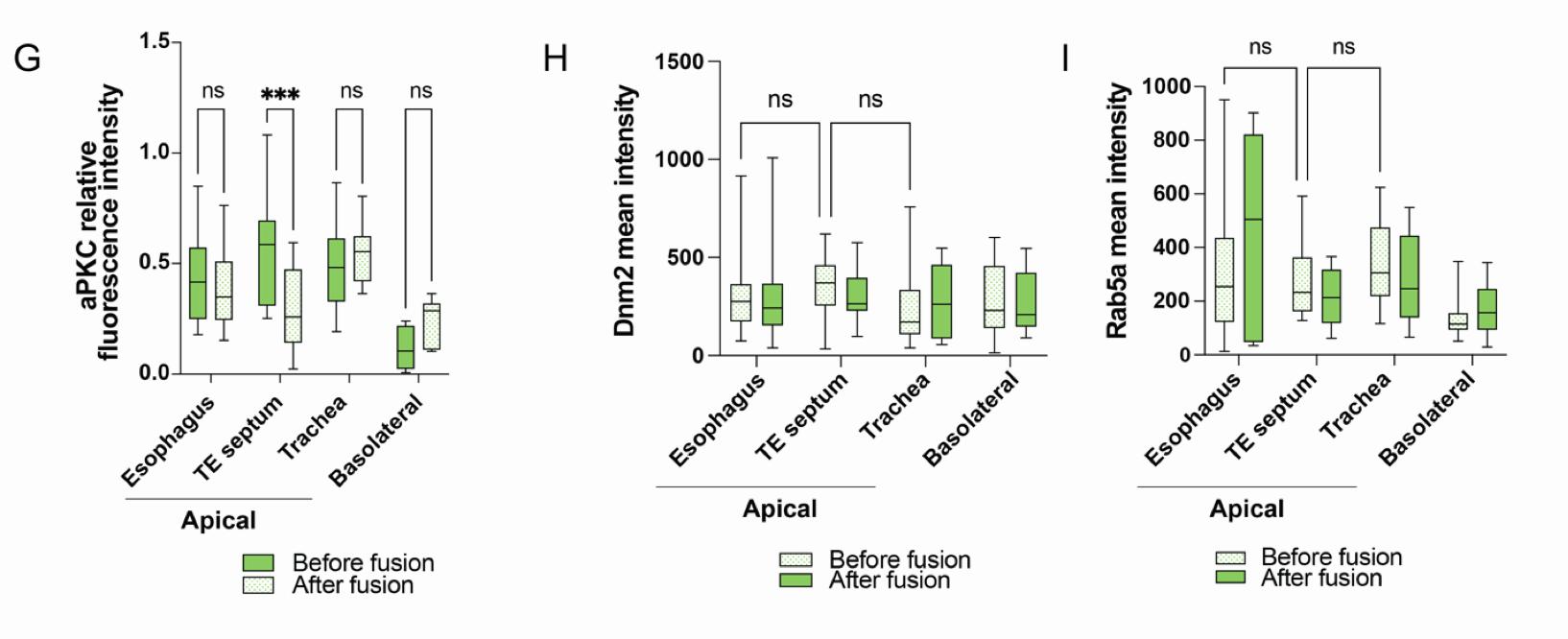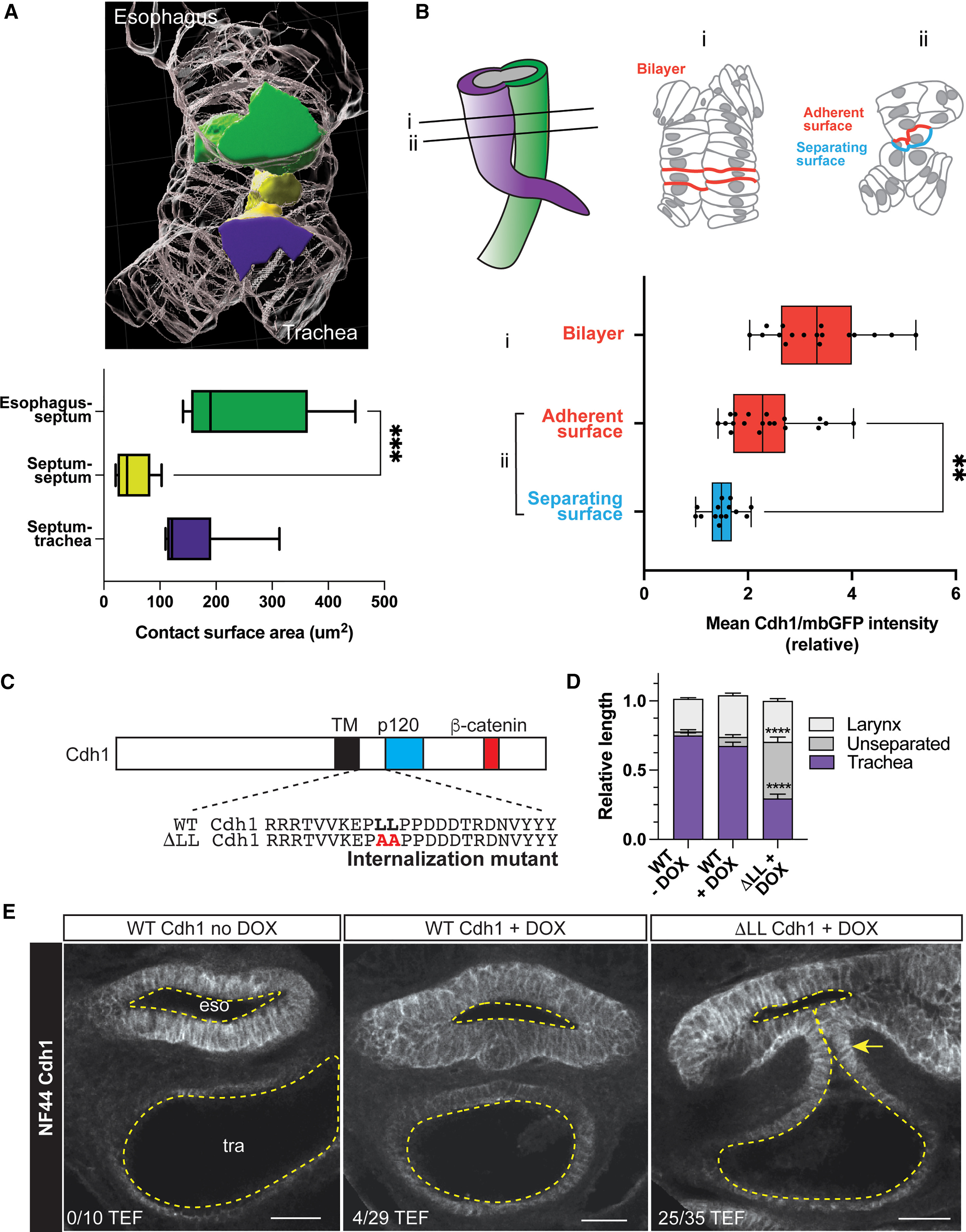 Disruptions in foregut morphogenesis can result in life-threatening conditions where the trachea and esophagus fail to separate, such as esophageal atresia (EA) and tracheoesophageal fistulas (TEFs). The developmental basis of these congenital anomalies is poorly understood, but recent genome sequencing reveals that de novo variants in intracellular trafficking genes are enriched in EA/TEF patients. Here, we confirm that mutation of orthologous genes in Xenopus disrupts trachea-esophageal separation similar to EA/TEF patients. The Rab11a recycling endosome pathway is required to localize Vangl-Celsr polarity complexes at the luminal cell surface where opposite sides of the foregut tube fuse. Partial loss of endosomal trafficking or Vangl-Celsr complexes disrupts epithelial polarity and cell division orientation. Mutant cells accumulate at the fusion point, fail to relocalize cadherin, and do not separate into distinct trachea and esophagus. These data provide insights into the mechanisms of congenital anomalies and general paradigms of tissue fusion during organogenesis.