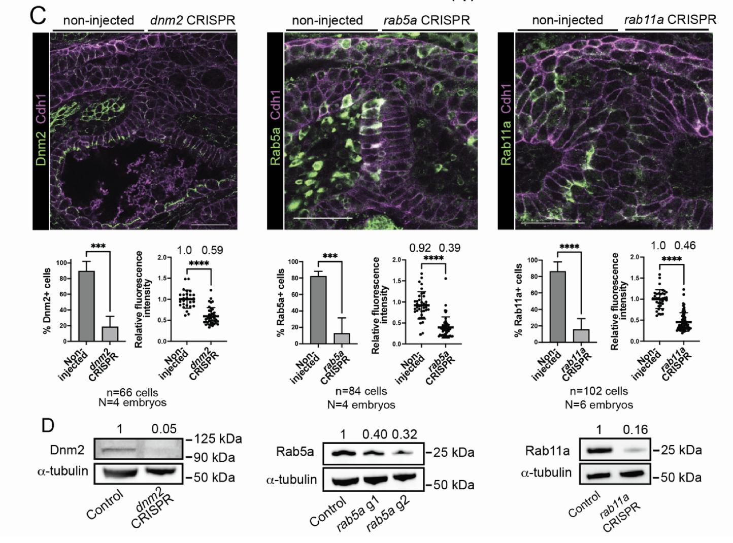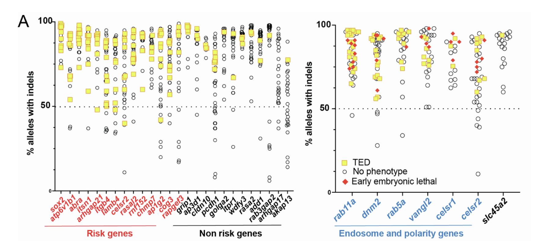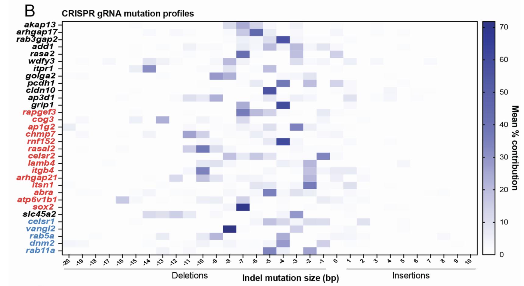 Lines/Strains: gRNAs referenced: abra gRNA1 add1 gRNA1 akap13 gRNA1 ap1g2 gRNA1 ap3d1 gRNA2 arhgap17 gRNA2 arhgap21 gRNA1 atp6v1b1 gRNA1 celsr1 gRNA1 celsr2 gRNA1 chmp7 gRNA1 cldn10 gRNA1 cog3 gRNA1 dnm2 gRNA1 golga2 gRNA1 itgb4 gRNA1 itpr1 gRNA1 itsn1 gRNA3 lamb4 gRNA1 pcdh1 gRNA1 rab11a gRNA1 rab3gap2 gRNA1 rab5a gRNA1 rab5a gRNA2 rapgef3 gRNA1 rasa2 gRNA1 rasal2 gRNA1 rnf152 gRNA1 slc45a2 gRNA1 sox2 gRNA1 tyr gRNA1 vangl2 gRNA1 wdfy3 gRNA1