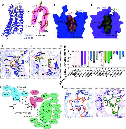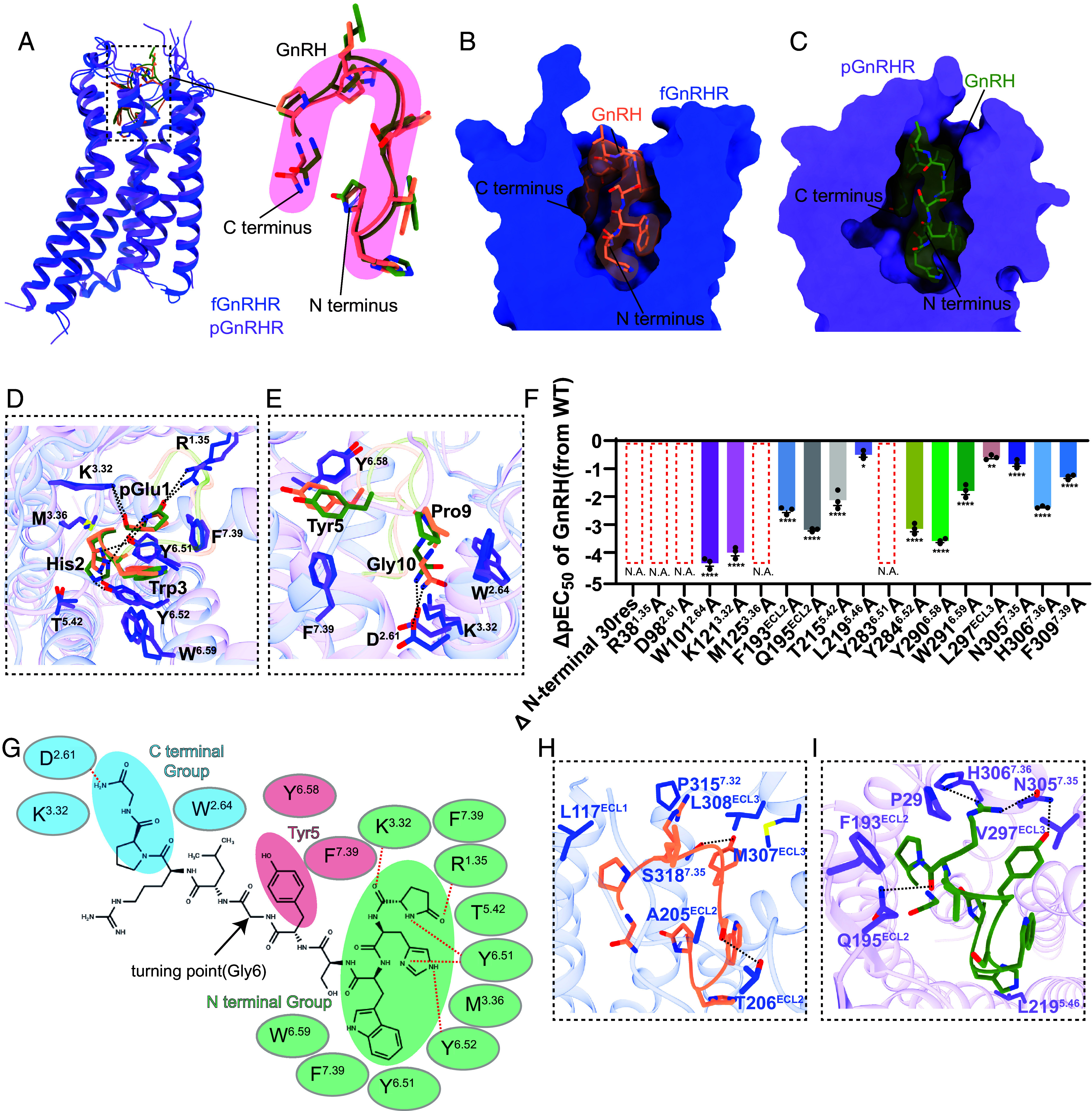 Fig. 2. The conserved binding pocket of GnRHs across GnRHRs. (A) The U-shaped conformation of GnRH within the binding pocket of GnRHRs. (B and C) Side view of similar binding modes of GnRH in fGnRHRs and pGnRHRs. Cryo-EM density maps of GnRH are shown in salmon and green, relatively. (D and E) Conserved interactions in the binding pocket across different GnRHRs. (F) The bar plot of ΔpEC50 of important residues in the binding pocket of hGnRHR. ΔpEC50 = pEC50 of GnRH to a specific mutant GnRHR–pEC50 of GnRH to WT GnRHR, which are all measured using IP1 accumulation assays. *P < 0.05; **P < 0.01; ***P < 0.001; ****P < 0.0001. Data were shown as mean ± SEM from three independent experiments, which were performed in triplicates; significance was determined with one-way ANOVA. N.A., no active receptors; dashed-border rectangles, inapplicable pEC50 of mutations causing significant reduction of ligand potency that were not able to be calculated. (G) 2D illustration of GnRH in the conserved binding pockets and corresponding interactions. (H and I) Species–specific interactions in the pockets of fGnRHRs and pGnRHRs, respectively. Side chains of residues are displayed in sticks. Hydrogen bonds are depicted as black dashed lines.