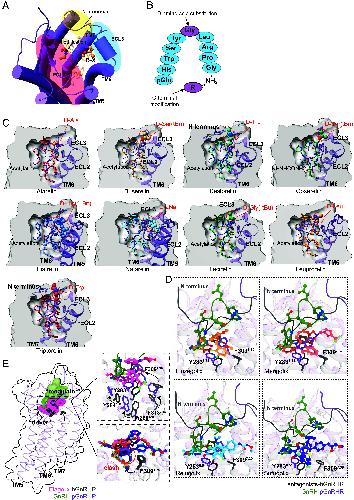 Fig. 4. SAR of GnRHR ligands. (A and B) 2D and 3D illustrations of engineered agonists of GnRHR with the sixth glycine substituted with D-type amino acids, along with a C-terminal modification. (C) Extra interactions formed by the side chain of the substituted D-type amino acids with N terminus, TM5-7, ECL2, or ECL3 of the pGnRHR by modeling. (D) Representative docking poses of GnRHR antagonists in the binding pocket of hGnRHR. (E) SAR principles of GnRHR ligands. The rotation of important residues upon activation compared with the inactive GnRHR are indicated by black arrows.