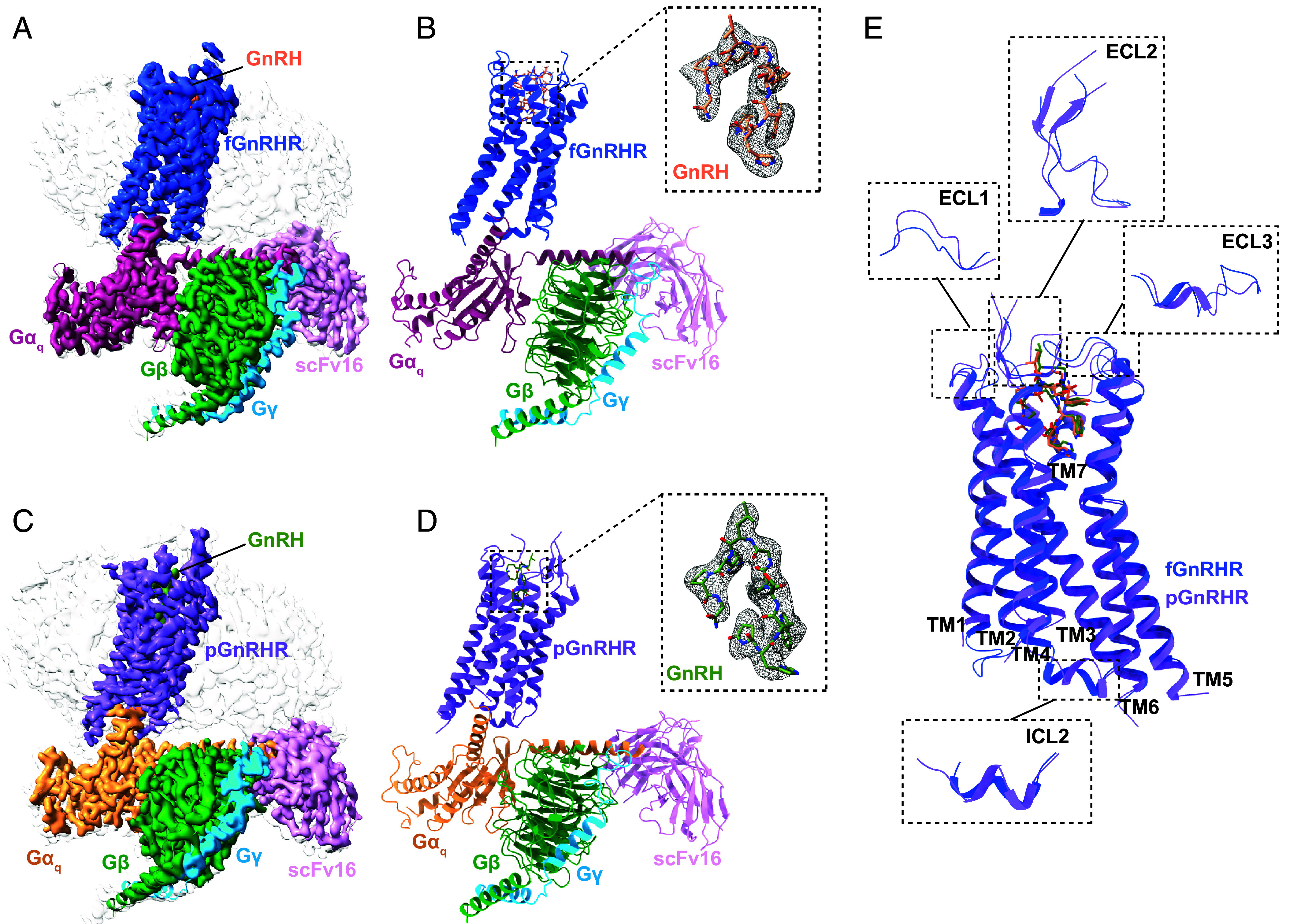 Fig. 1. Structure features of fGnRHR and pGnRHRs bound to GnRH. (A and B) Orthogonal views of the cryo-EM density map and the corresponding atomic model of the GnRH–fGnRHR–miniGq complex. (C and D) Orthogonal views of the cryo-EM density map and the corresponding atomic model of the GnRH–pGnRHR–miniGq complex. (E) Structural differences between ICL2 and ECLs of fGnRHRs and pGnRHRs. fGnRHR is shown in blue and pGnRHR is shown in purple.