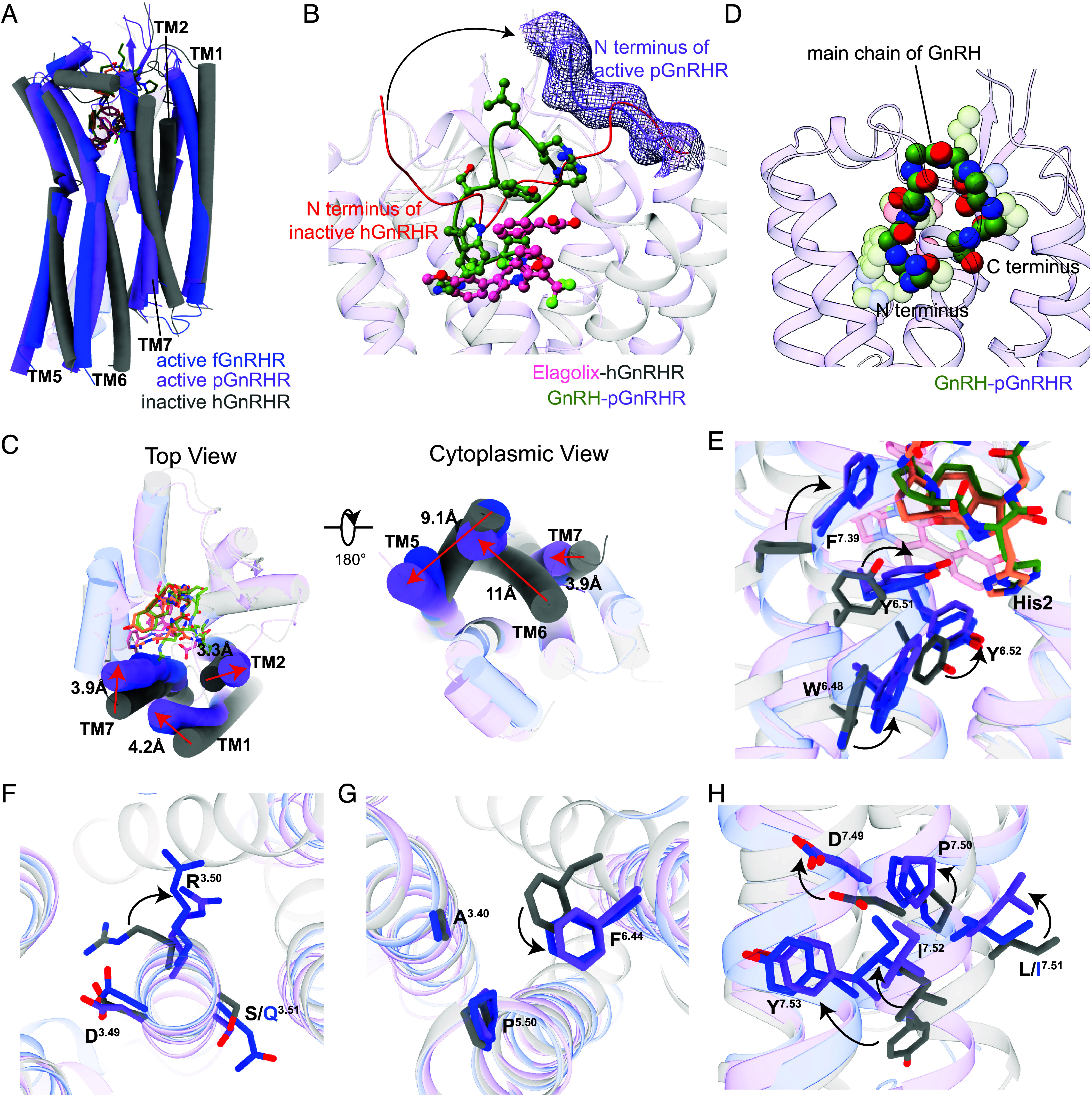 Fig. 3. Activation mechanism of GnRHR. (A) Structural superposition of active GnRHRs and the inactive hGnRHR (PDB: 7BR3) from the side view. (B) Different modes of N terminus of inactive human and active pGnRHRs. The N terminus of inactive hGnRHR is highlighted in red. The movement directions of the N terminus is highlighted as a black arrow. (C) Top and cytoplasmic views of active GnRHRs and the inactive GnRHR. The movement directions of TMs of active GnRHRs relative to those of inactive GnRHR are highlighted as red arrows. The distances of the movements are measured by pig and hGnRHRs. (D) The insertion of the N-terminal segment of GnRH is deeper into the TMD core than the C terminus. (E) Activation of GnRHRs induced by the His2 of GnRH. (F–H) Conformational changes of the microswitches upon GnRHR activation such as DRS (F), PAF (G), and DPxxY (H) motifs. The rotation directions of residue side chains upon pGnRHR activation compared with the antagonist-bound hGnRHR are indicated by black arrows.