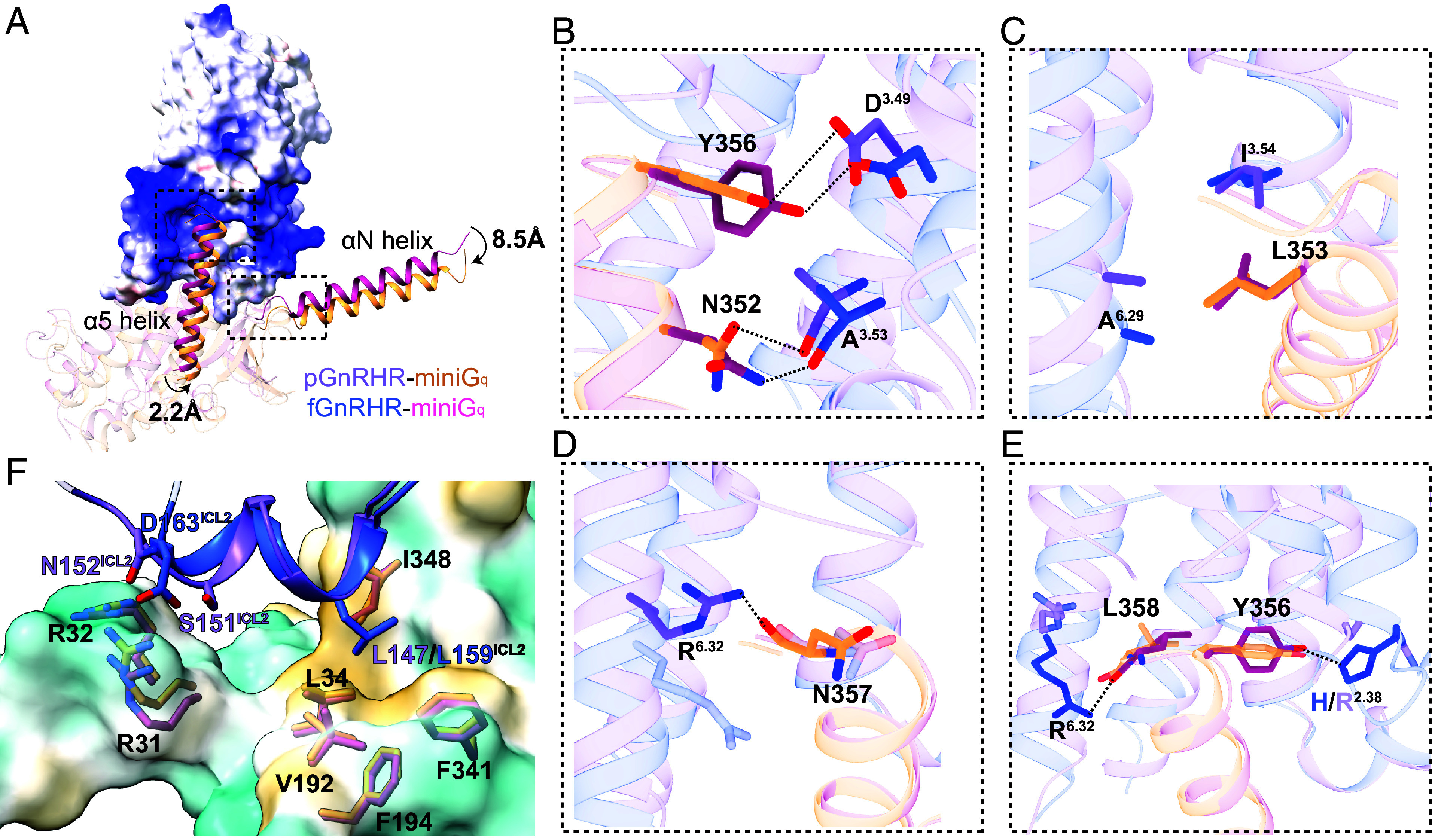 Fig. 5. Gq protein coupling by GnRHRs. (A) Deviation of α5 and αN helix of Gq protein in assembly with different GnRHRs. (B and C) Conserved interaction of hydrophilic and hydrophobic interactions between GnRHRs and Gq protein. (D and E) Species-specific interactions of pig (D) and frog (E) GnRHRs and Gq protein. (F) The hydrophobic and hydrophilic interfaces formed by ICL2 of GnRHRs and the αN helix of Gαq. Side chains of residues are displayed in sticks. Hydrogen bonds are depicted as black dashed lines.